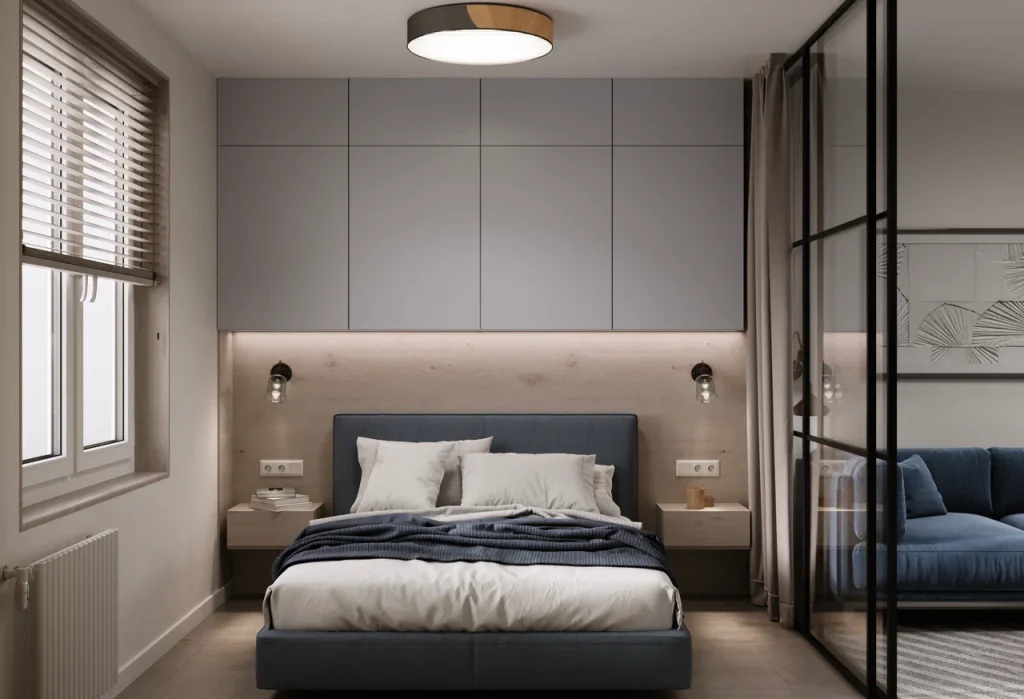 Чтобы кухня-гостиная имела и естественное освещение, спальня отделена от нее прозрачными раздвижными перегородками по типу японских сёдзи, которые на ночь задвигаются теневыми шторами. Цветовое решение спальни такое же, как и в остальной квартире - в голубых и бежевых оттенках с небольшим добавлением акцентного серого.