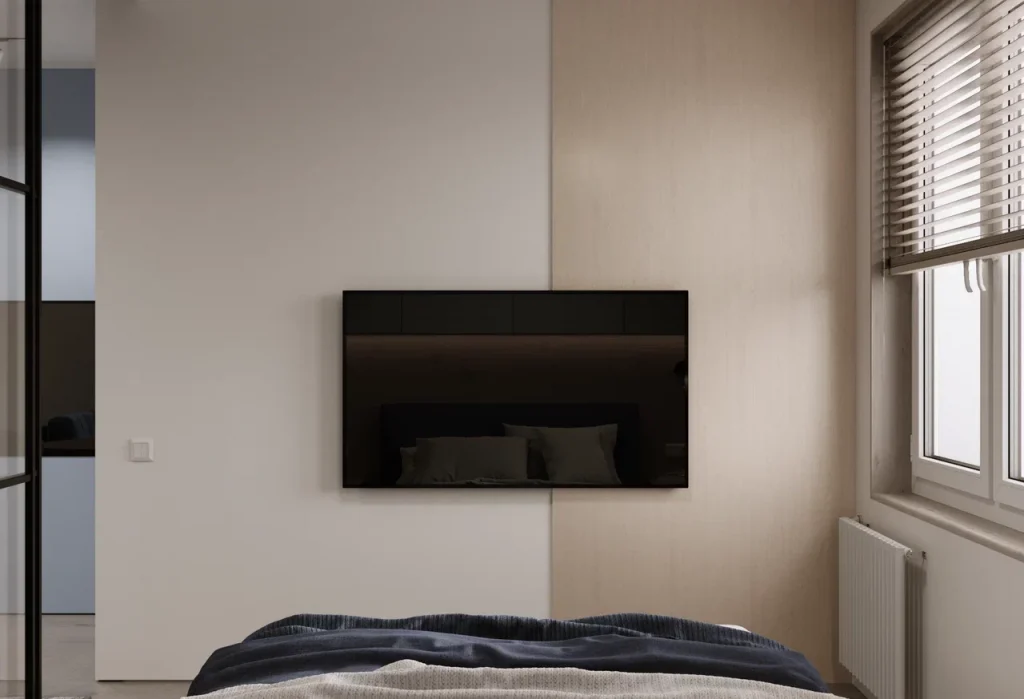 Спальня, с учетом пожелания заказчиков, организована в наибольшей степени минималистично и функционально. Так, единственной мебелью (помимо двуспальной кровати, разумеется) в ней служат подвесные односекционные подвесные тумбочки. Напротив кровати мы разместили ТВ панель. Основным источником естественного освещения в спальне является большое окно. А искусственное освещение обеспечивается: лампой посредине потолка, что дает основное освещение и боковые минималистичные бра, придающие уют комнате.