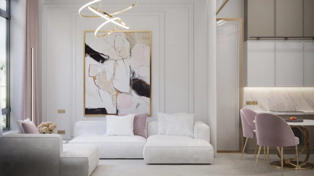 Трехкомнатная квартира для супружеской пары с дочкой 5 лет в стиле современная классика, с прихожей, кухней-гостиной, гардеробной, спальней, детской и ванной.