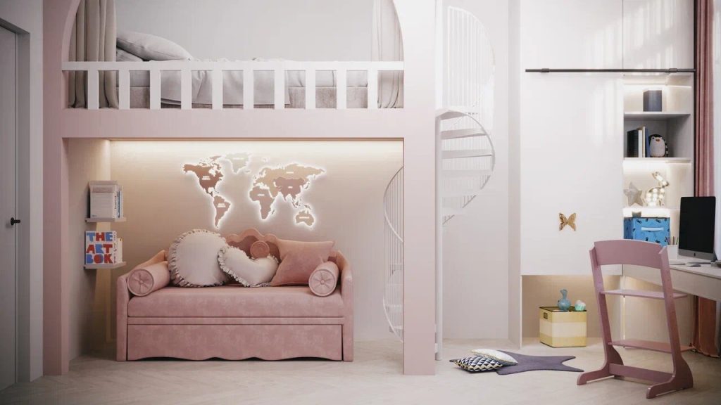 В детской по пожеланию заказчиков сделана двухъярусная кровать, чтобы задействовать как можно больше места. Так как девочка, как и мама, профессионально занимается балетом, сверху кровать сделали аркой, напоминающей сводные потолки La Scala, чтобы добавить комнате эксклюзивности и подчеркнуть увлеченность любимым делом юной балерины. Потому как спальня - для девочки, в отделке использованы светлые оттенки и пудровый розовый штор, дивана и стульчика.