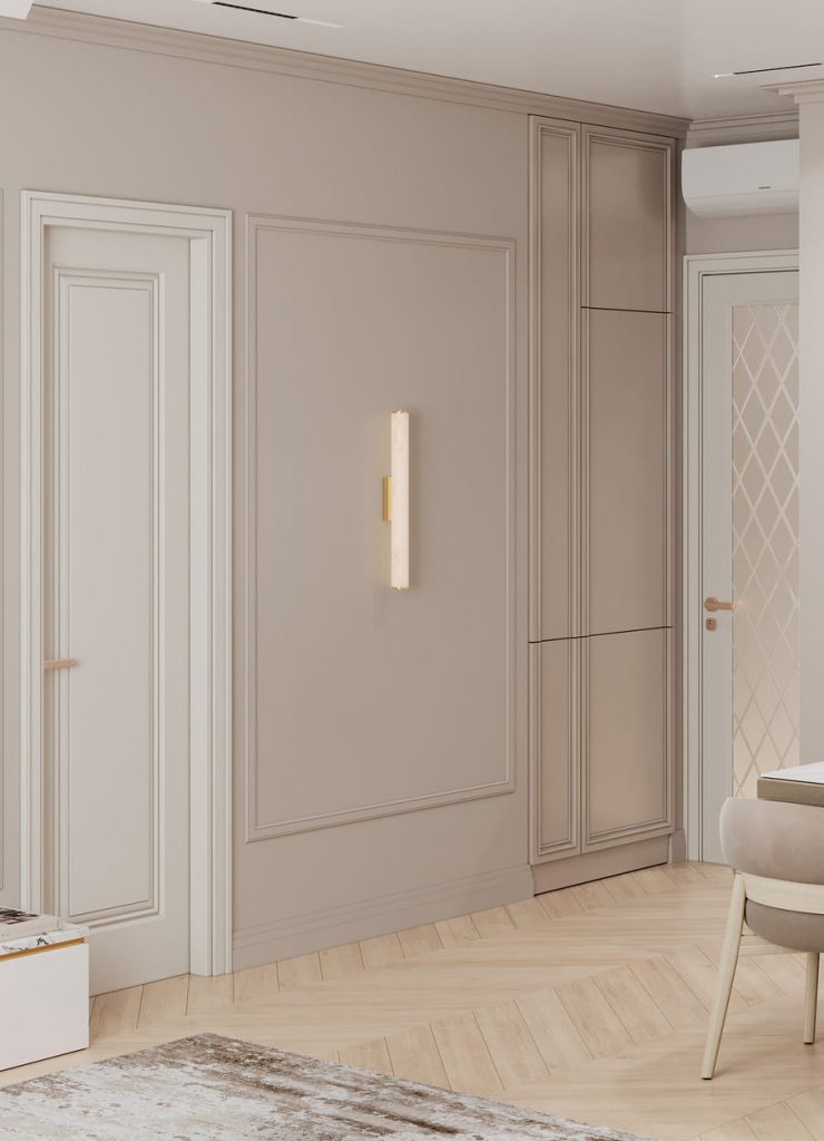 Дизайн этой квартиры разработан специально для зрелой пары, ценящей комфорт, простоту и эстетичную гармонию. Интерьер выполнен в современном стиле неоклассика, где сдержанная роскошь сочетается с практичностью. В основе — светлая палитра пастельных тонов, наполняющих пространство воздухом и светом.