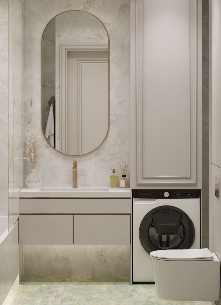 Плавные формы овального зеркала и вертикальных фасадов мягко перекликаются с изогнутым силуэтом подвесного унитаза и стильным латунным смесителем. Умывальник с подсветкой создаёт ощущение парящей конструкции и добавляет интерьеру лёгкости.