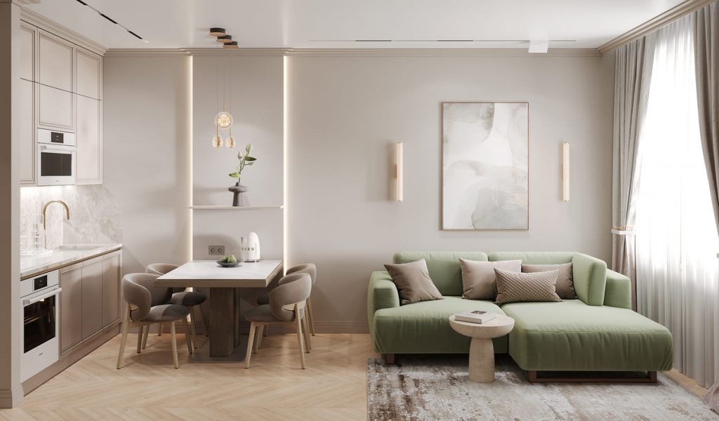 Гостиная часть оформлена расслабленно и светло. Акцентным элементом становится диван насыщенного оливкового оттенка, который задаёт тон всей комнате. Картина в мягкой акварельной гамме и минималистичные бра поддерживают гармонию и ритм.