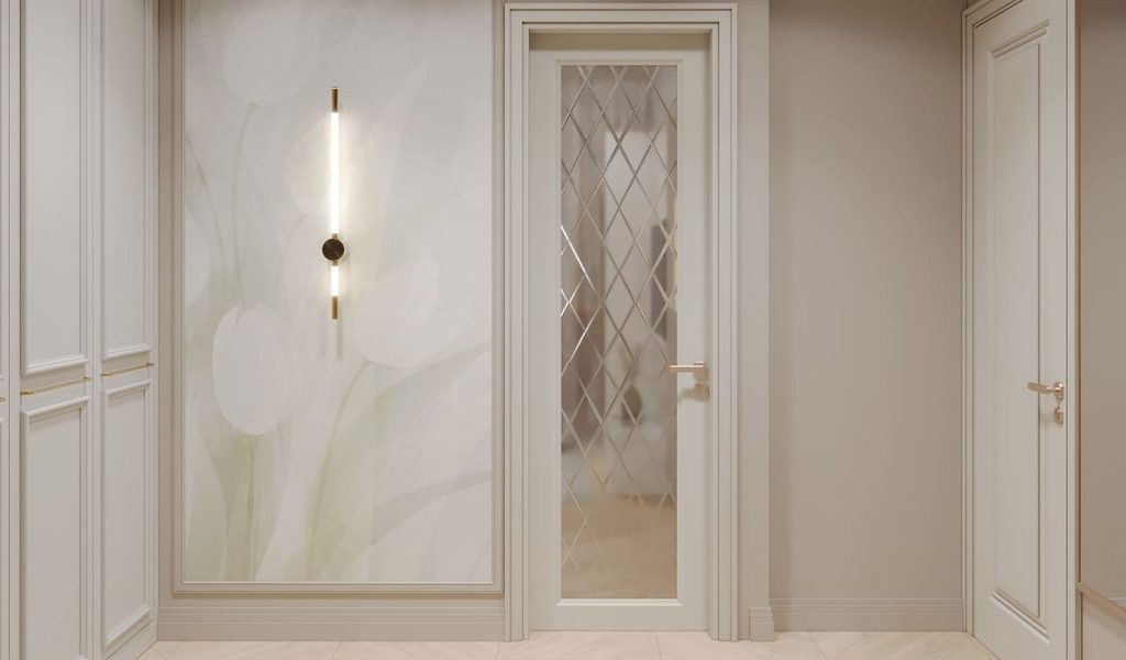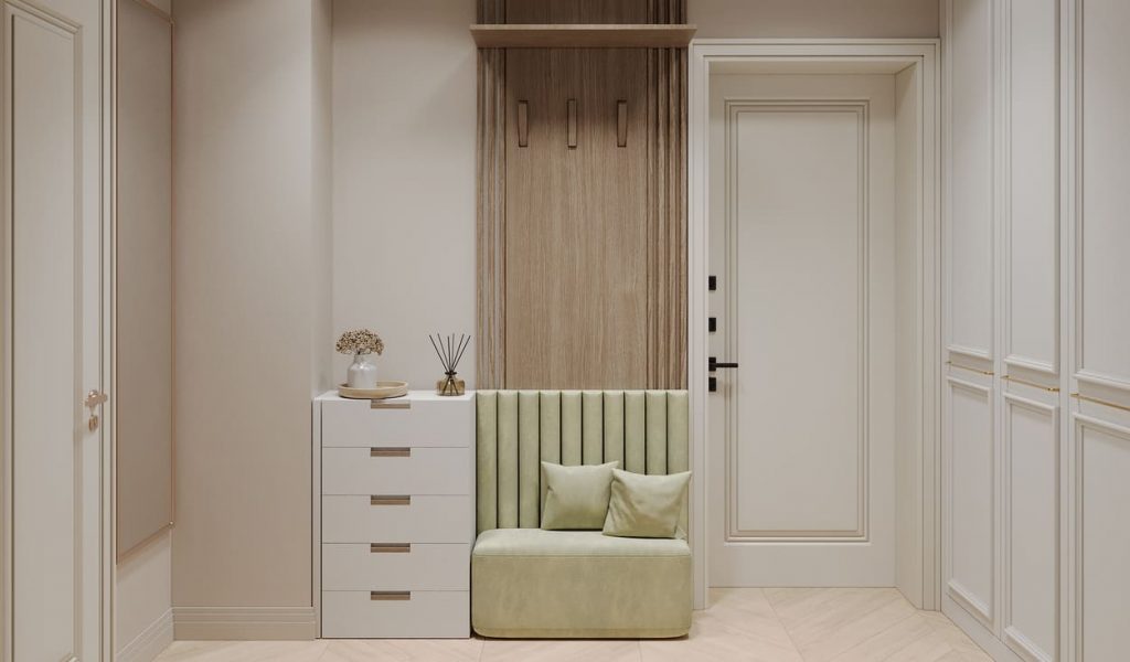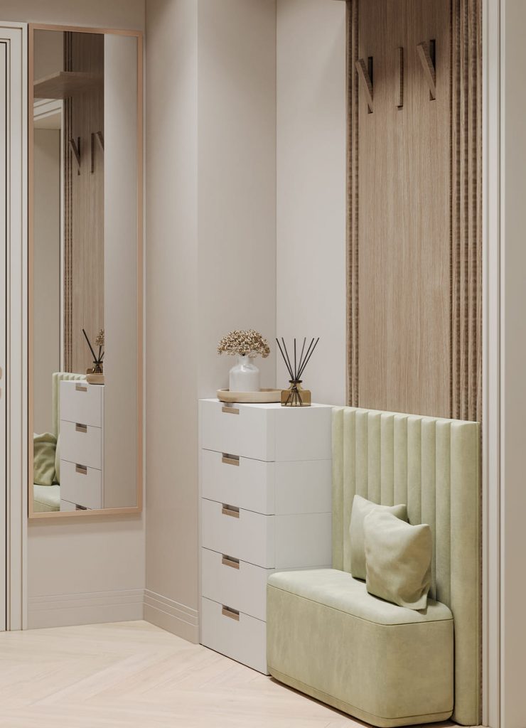В прихожей встроенный шкаф с лаконичным декором решает вопрос хранения, не перегружая интерьер. Комфортное мягкое сиденье с высоким изголовьем в нежном оливковом оттенке приглашает присесть — переобуться или просто ненадолго замедлиться. Над ним — деревянная панель с вертикальной фактурой и аккуратными крючками для верхней одежды.
