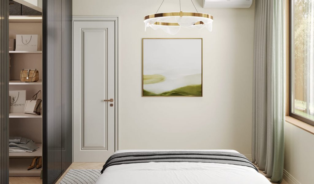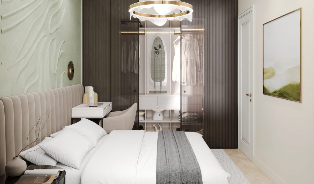Акцентная стена за кроватью выполнена в нежном зелёном оттенке с декоративной 3D-штукатуркой — она добавляет объёма и художественного ритма. Поддерживает композицию стильный светильник с плавными формами и латунными акцентами, которые вносят нотку изысканности.