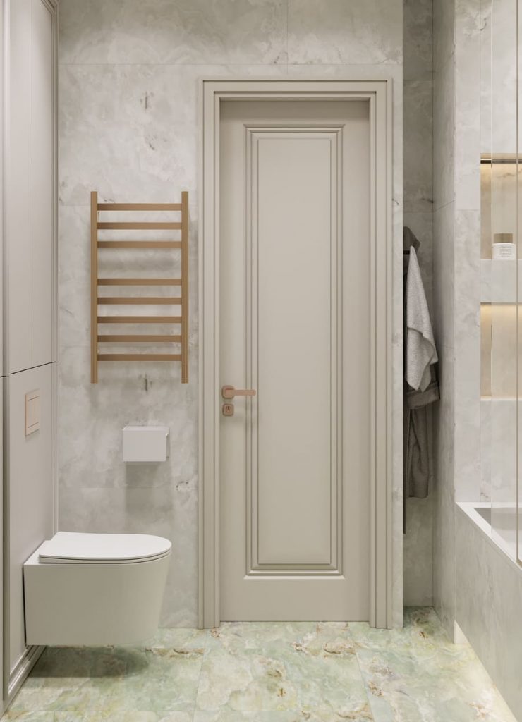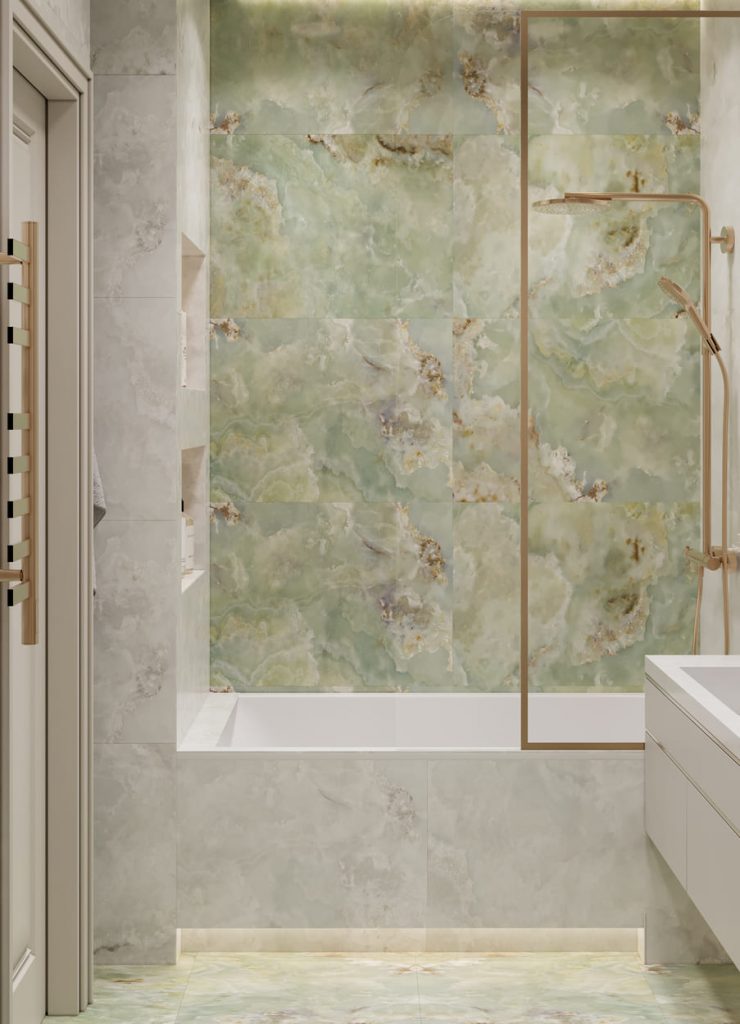 Пространство оформлено в светлой гамме с выразительным акцентом на мраморную плитку в оттенках зелёного оникса. Этот природный рисунок создаёт эффект глубины и лёгкого движения — словно отражение воды в камне.