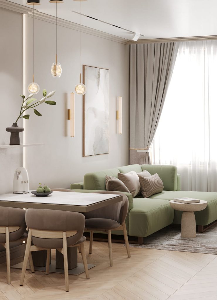 Светлая и элегантная квартира для пожилой пары с акцентами в зеленных оттенках