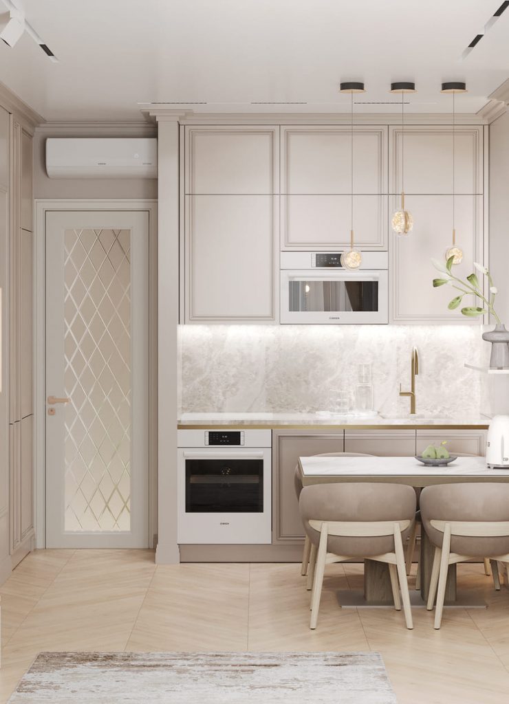 Кухонный гарнитур выполнен в классических фасадах с благородной нейтральной палитрой. Мягкий беж сочетается с текстурой натурального камня на фартуке и столешнице, а акценты из латуни — в том числе изящный смеситель — добавляют нотки утончённости. Вся техника встроена, что поддерживает ощущение целостности и порядка.
