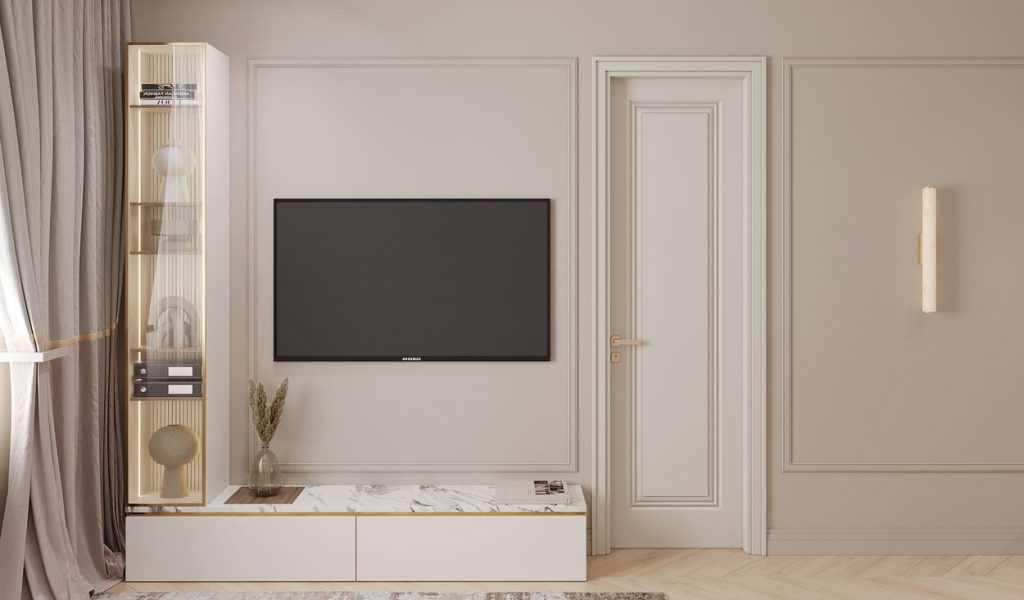 Телевизионная зона лаконична, но при этом не лишена индивидуальности: мраморная поверхность тумбы, стеклянный шкаф с подсветкой и аккуратно расставленные декоративные элементы добавляют интерьеру глубины.