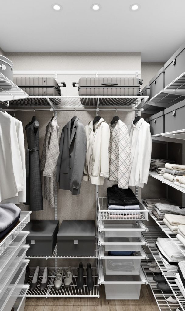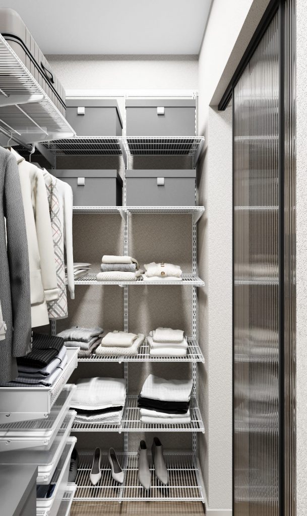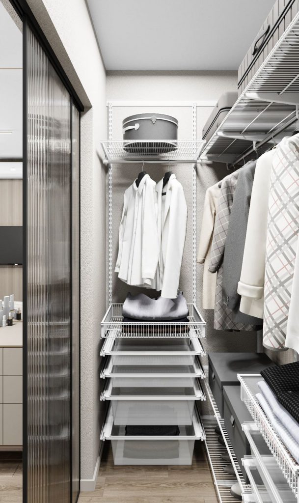 Вместительная гардеробная, размещенная за раздвижными дверями из рифленого стекла, имеет все возможные секции - нижние полки для обуви, выдвижные ящики для сумок и обуви, полки для сложенных вещей, отделения со штангами для вешалок с одеждой, верхние полки для чемоданов и коробок с обувью.