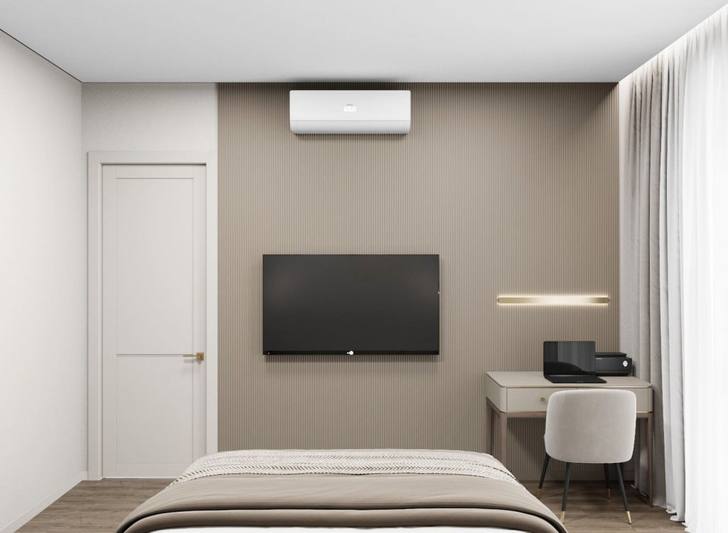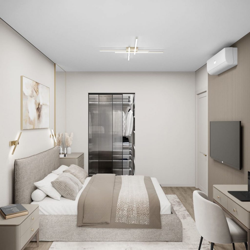 Просторная спальня организована по принципу мастер-спальни - здесь помимо зоны отдыха по пожеланию заказчика имеются рабочее место и полноценная гардеробная, чтобы заранее учесть возможные потребности будущих арендаторов. Зона отдыха включает большую двуспальную кровать, со стороны мужа - прикроватный столик-тумбочку с выдвижными ящиками, а со стороны жены - целую бьюти-зону с комодом с шестью выдвижными ящиками и ростовое зеркало до потолка, напротив кровати - большая ТВ-панель без тумбы, чтобы не преграждать проход. Рабочее место - это письменный стол-консоль, который выполнен в таком же стиле, как и прикроватные столик-тумба и комод; и удобный стул-кресло.
