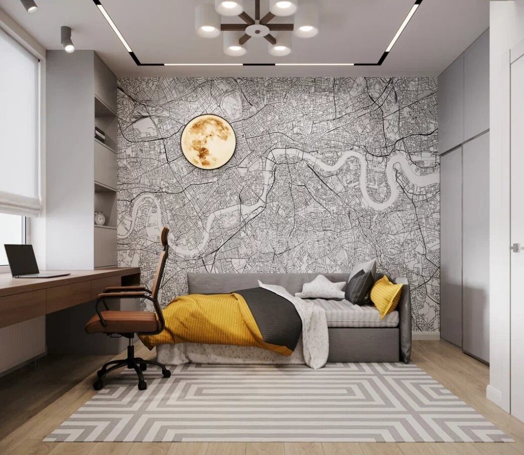 Очень внимательно мы отнеслись к организации освещения детской. Так, днем основное обеспечивается большим окном, вечером - подсветкой потолка и минималистичной люстрой, дополнительное: в зоне сна - оригинальным бра-луной, в зоне рабочего места - потолочными светильниками-прожекторами, а в модулях по бокам от рабочего стола - подсветкой. По просьбе заказчиков в оформление детской добавлены оригинальные фотообои с имитацией карты геолокации (в зоне за кроватью-диваном).