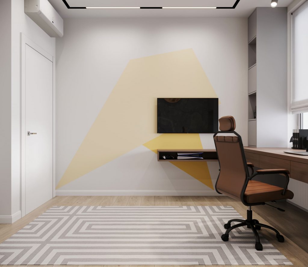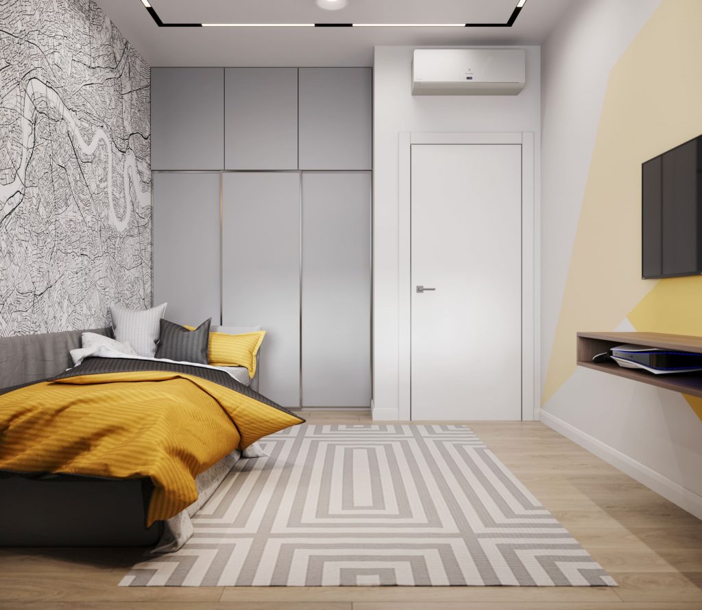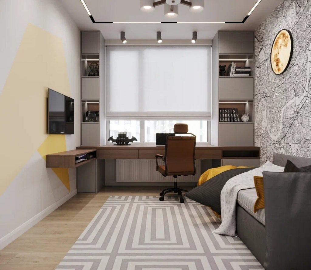 Детская включает несколько функциональных зон - отдыха, рабочего места и системы хранения. Первая представлена компактным диваном-кроватью, небольшой ТВ-панелью и узкой подвесной ТВ-тумбой с открытой секцией. Рабочее место оборудовано вместительным встроенным компьютерным столом с выдвижными секциями, в которые можно положить канцелярские принадлежности, тетради, блокноты и прочее, и комфортным компьютерным креслом. Зона хранения в детской представлена двумя встроенными модулями по бокам от компьютерного стола с открытыми и закрытыми секциями и большим встроенным гардеробным шкафом.