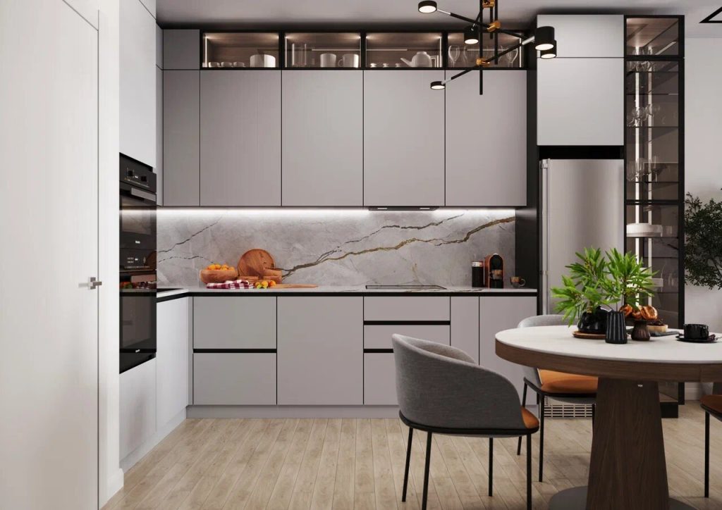 Кухня-гостиная совмещает в себе несколько зон - кухонную, обеденную, отдыха. В кухне-нише имеется все, что необходимо - встроенные: СВЧ с духовым шкафом, мойка, плита, разделочные столы-модули, а также верхние шкафы и дополнительный ряд секций со стеклянными прозрачными дверцами, холодильник. Обеденная зона - это эргономичный круглый стол с четырьмя удобными мягкими стульями.