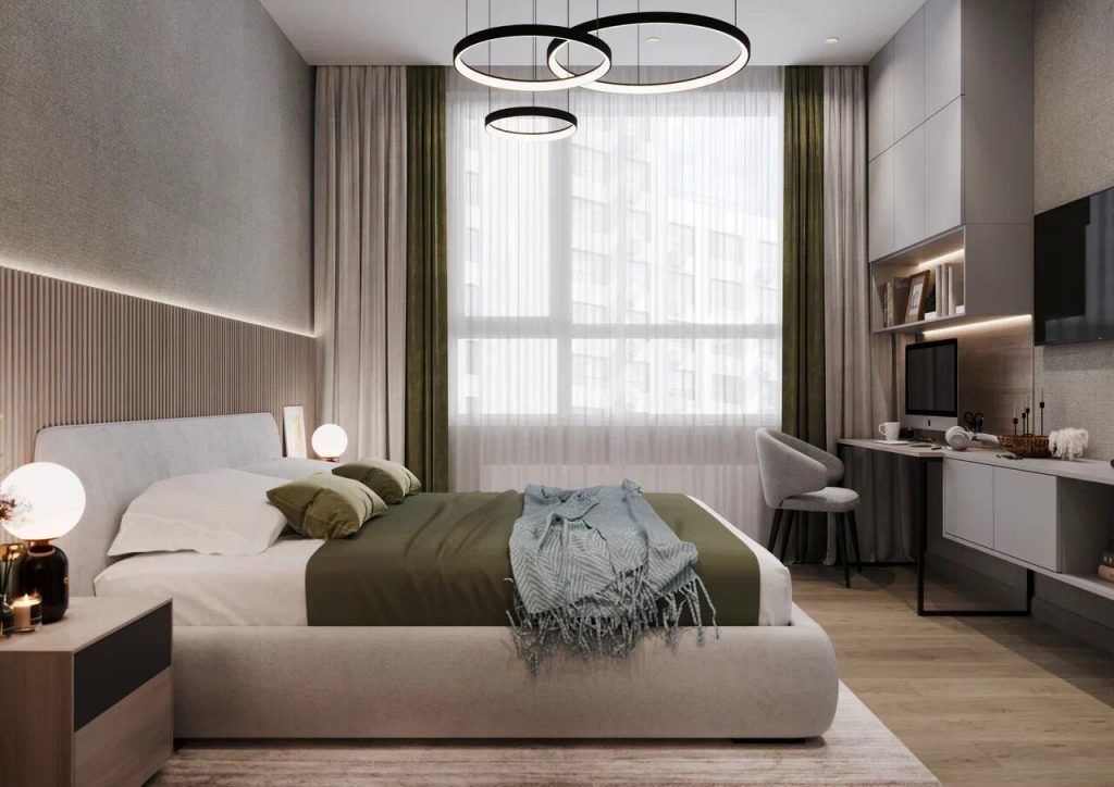 В спальне имеется три зоны - отдыха, рабочего места и хранения. Зона отдыха - это большая удобная кровать с минималистичным прикроватными тумбочками и ТВ панель с подвесной тумбой с двумя закрытыми и одной открытой секцией. Зона рабочего места представлена вместительным компьютерным столом, удобным креслом-стулом и подвесной полкой для книг. Система хранения спальни включает большой встроенный гардеробный шкаф с зеркальными дверями, создающими эффект двойного пространства и антресольные шкафы над полкой для книг в зоне рабочего места.