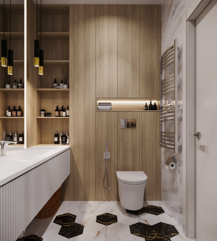 Душевая оформлена оптимально минималистично и включает лишь необходимое - собственно, душевую, унитаз, мойку с подвесной компактной тумбой и большим зеркалом до потолка над ней. В помещении предусмотрены функциональные системы хранения - над столешницей раковины - встроенный модуль с полками, в душевой - полки-ниши, над унитазом - тоже встроенная полка-ниша, перед входной дверью также имеется встроенный модуль с полками. А слева от входа в помещение размещен полотенцесушитель. Тщательно продумали мы освещение душевой - основное дают точечные светильники потолка, дополнительное - подсветка зеркала, подвесные светильники над мойкой, подсветка полок - над унитазом и в модуле около выхода.