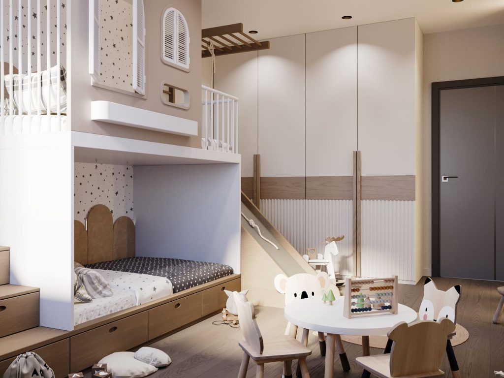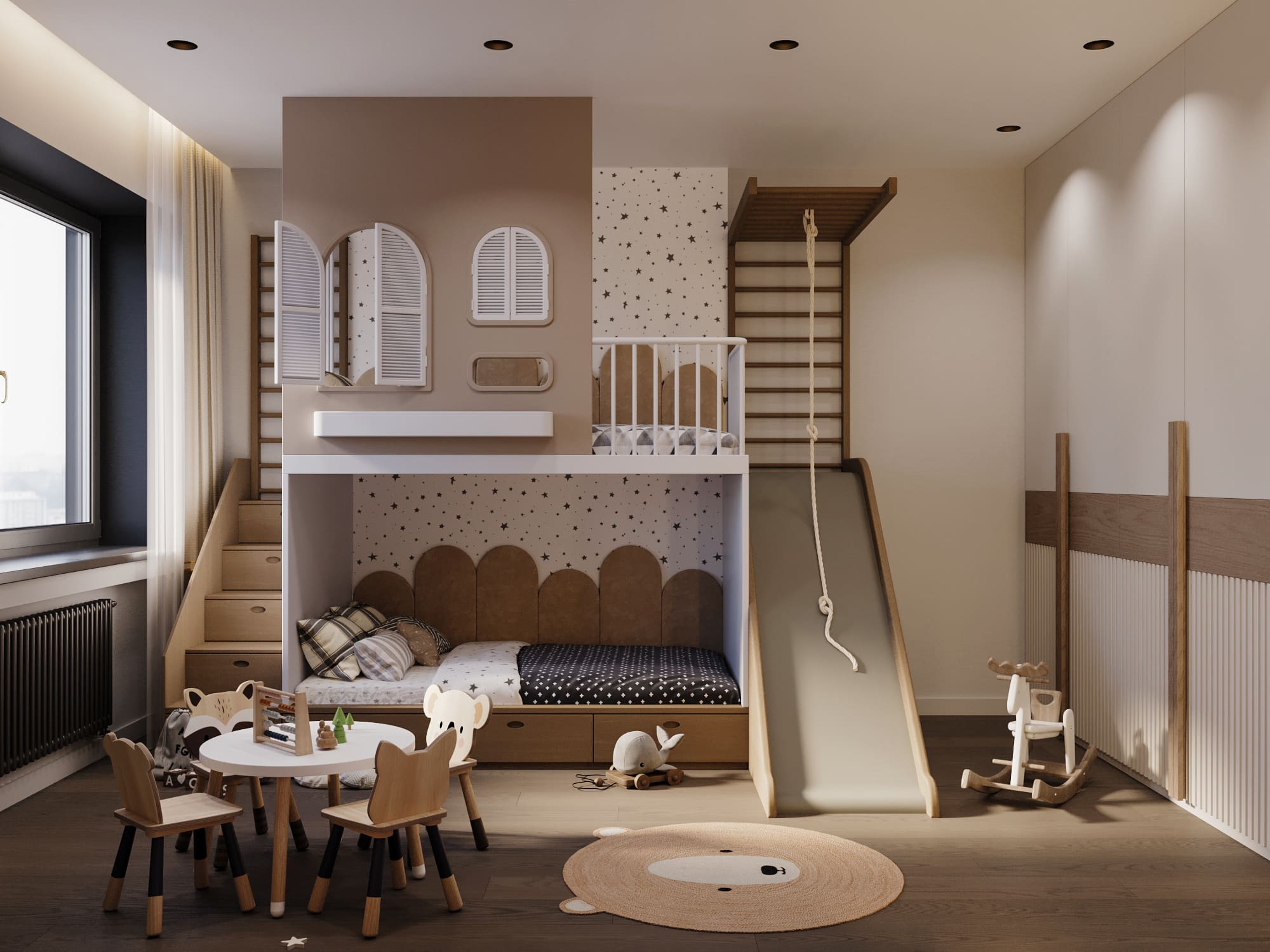 Справа от кровати установлена шведская стенка с канатом и горкой — она превращает комнату в полноценную развивающую среду, где физическая активность становится естественной частью дня. С противоположной стороны лестница также оснащена шведской стенкой, что делает подъём на верхний ярус ещё и элементом игры.