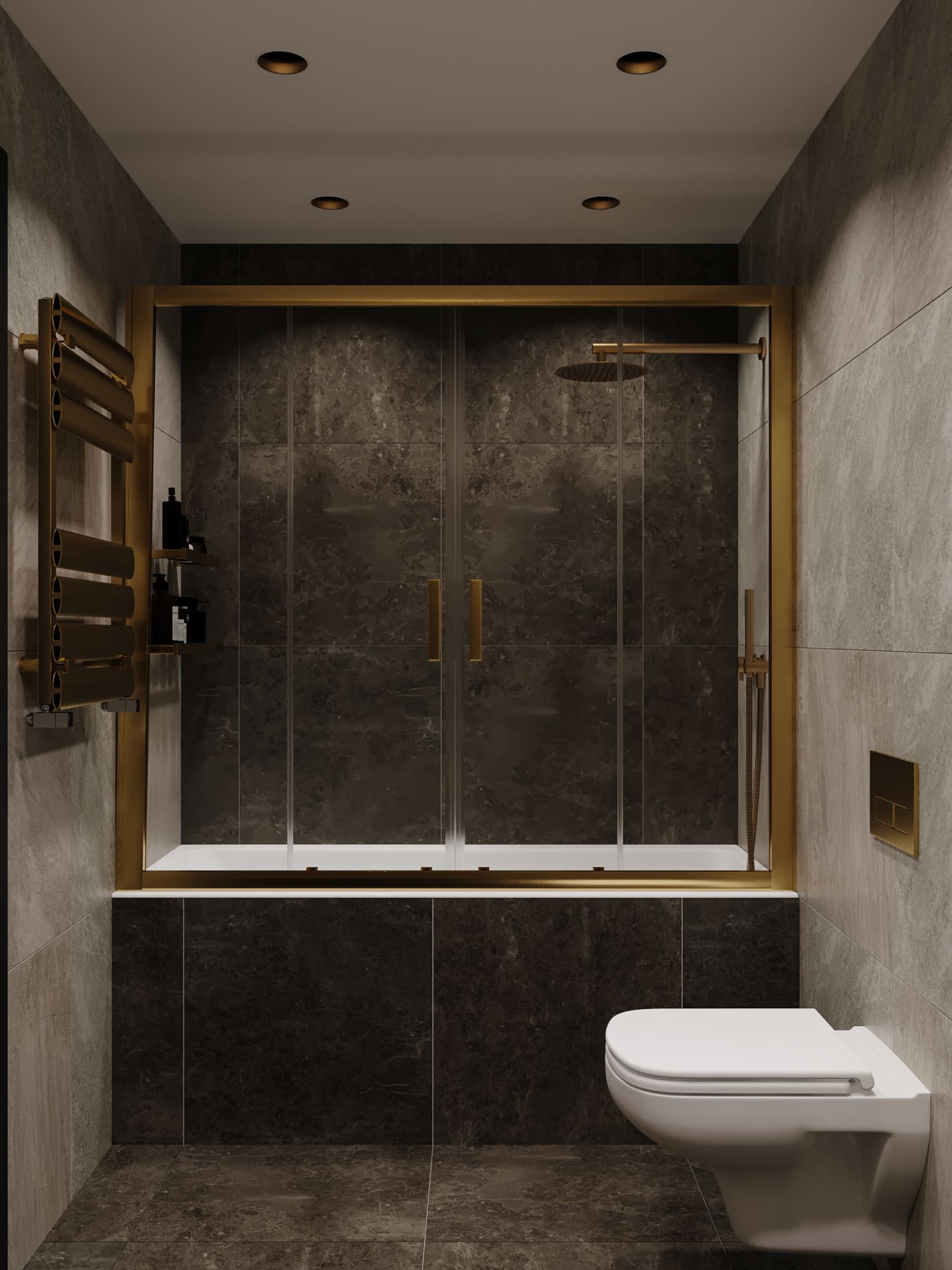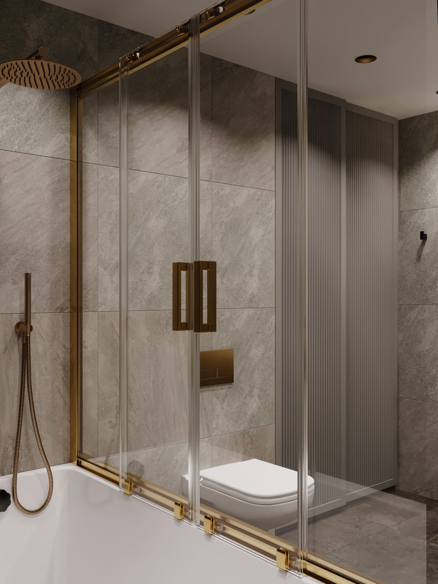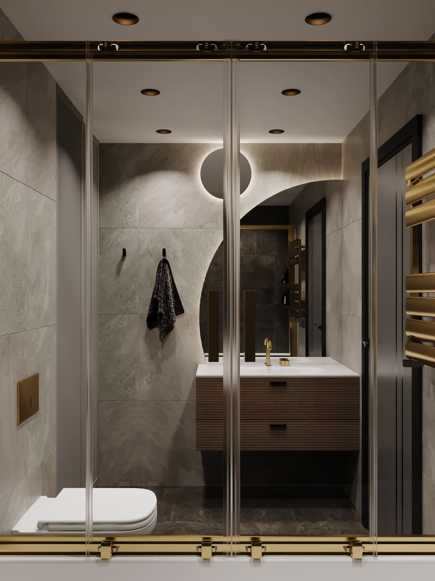 Ванна с прозрачными стеклянными дверцами расположена в зоне, отделанной тёмным керамогранитом, — этот приём визуально выделяет мокрую зону, добавляя интерьеру графичности и глубины. Белый унитаз, напротив, остаётся нейтральным, не перетягивая внимание. Стены выполнены в светлых тонах, что создаёт спокойную, воздушную базу. Золотистые акценты — смеситель, рамка стеклянного ограждения ванны и полотенцесушитель — объединяют пространство в единую композицию, добавляя ему тёплого свечения и элегантности. У входа расположена раковина с деревянной столешницей и золотыми элементами. Над ней — круглое зеркало с подсветкой, которое обеспечивает мягкое, равномерное освещение лица и становится выразительным акцентом.
