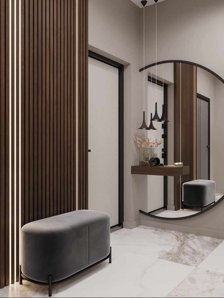 Ключевой акцент — большое круглое зеркало. Его мягкая форма смягчает геометрию и визуально расширяет пространство. Вертикальные рейки на стене добавляют текстурного разнообразия, не перегружая интерьер. Перед ними — светло-серая банкетка, удобная для повседневного использования и работающая как композиционный акцент.