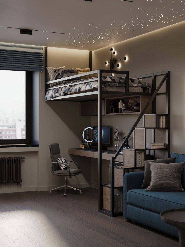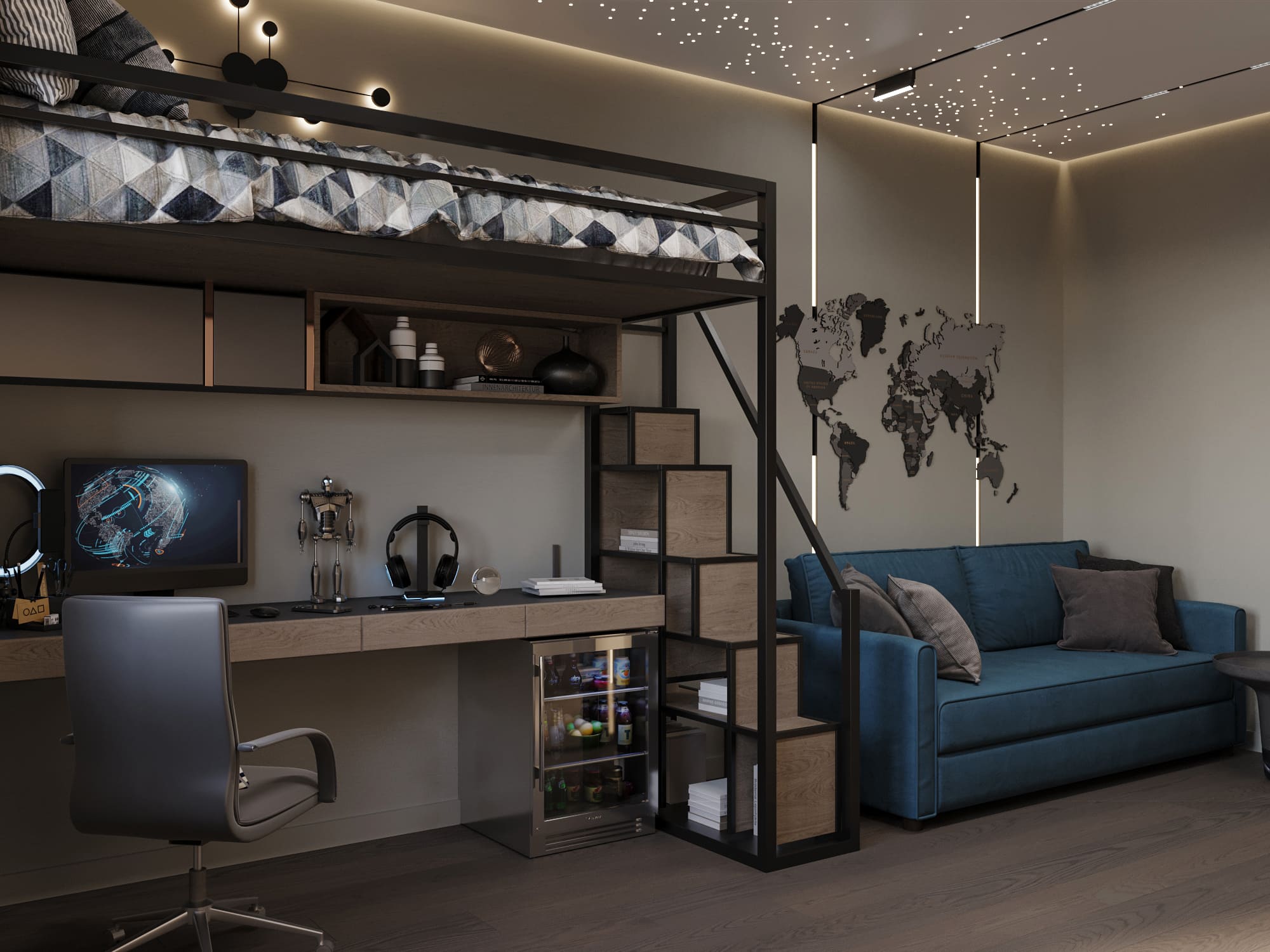 Главный функциональный элемент — двухъярусная кровать, нижний уровень которой отведён под рабочее место. Такое решение позволяет эффективно использовать вертикальное пространство, что особенно важно для школьника или студента. Акцентами выступают синий диван и металлические детали, которые добавляют динамики и делают интерьер более выразительным.