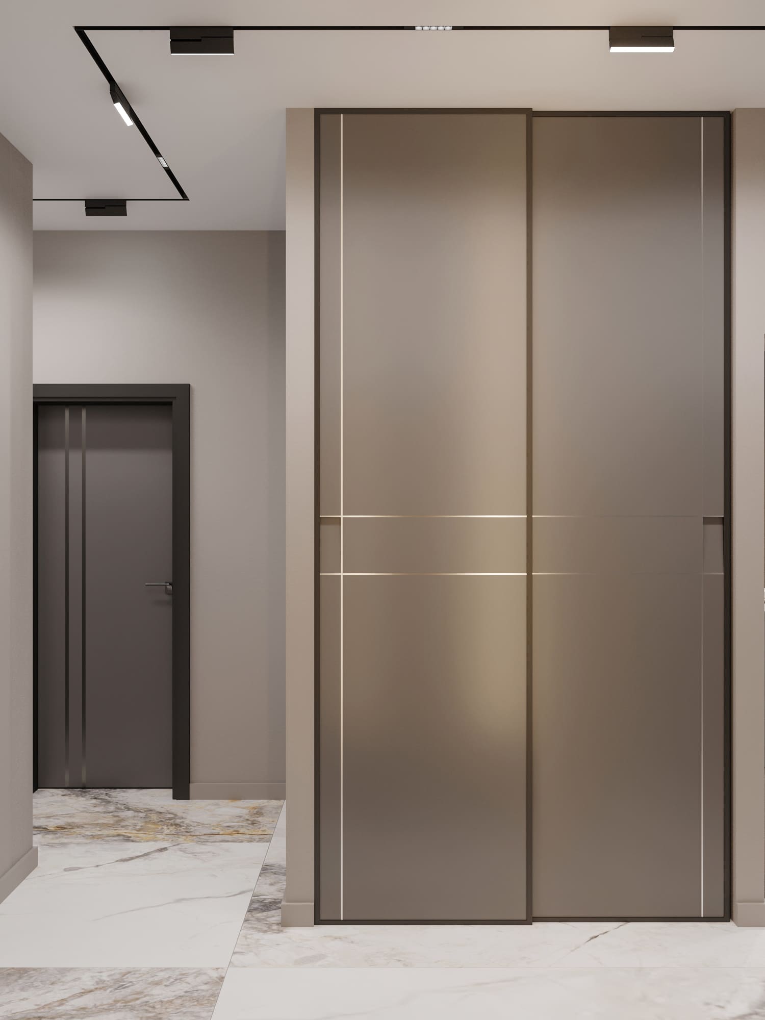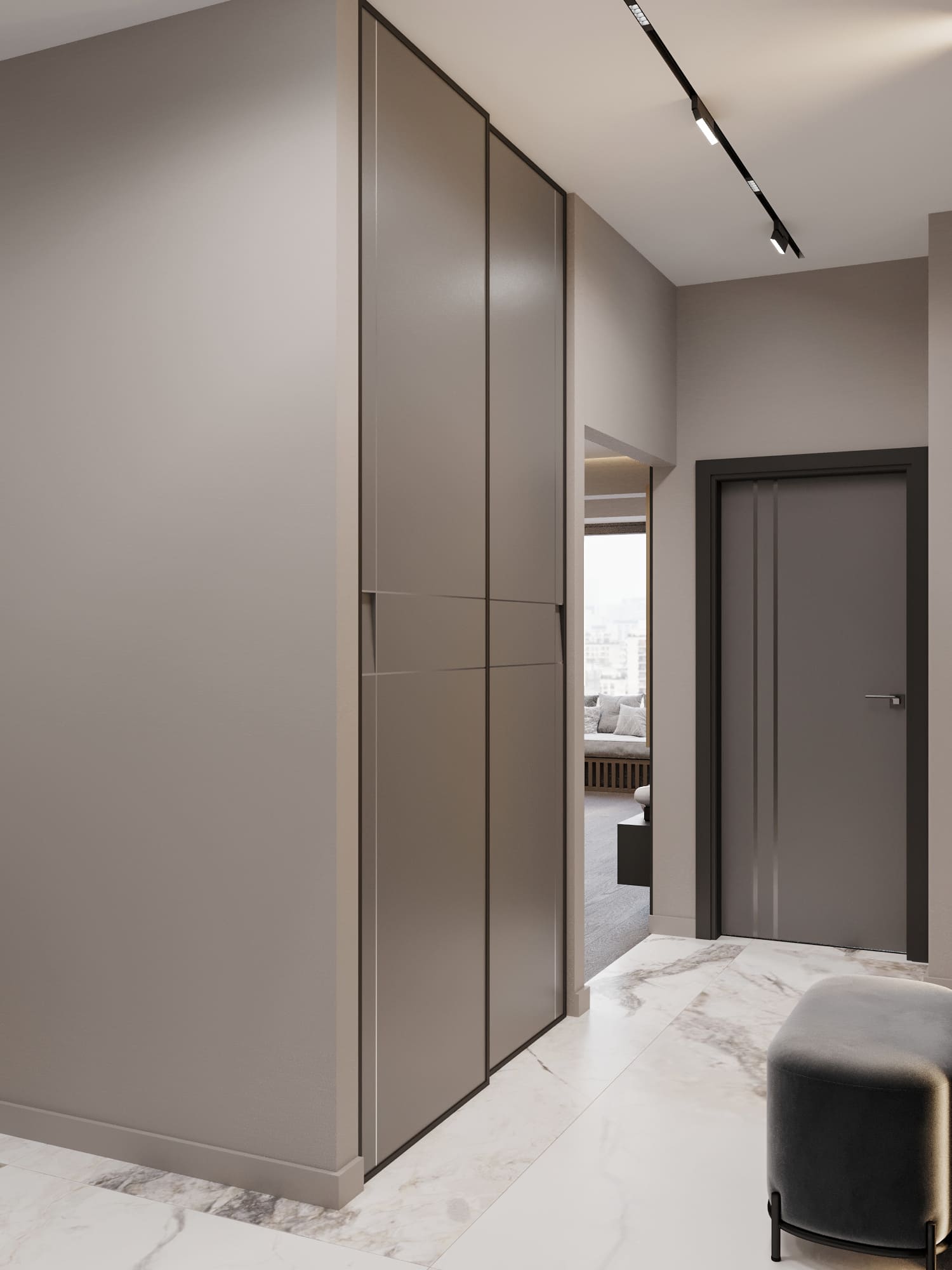 Прихожая решена в нейтральной палитре бежевых и серых оттенков — это задаёт спокойную, располагающую атмосферу с первых шагов.