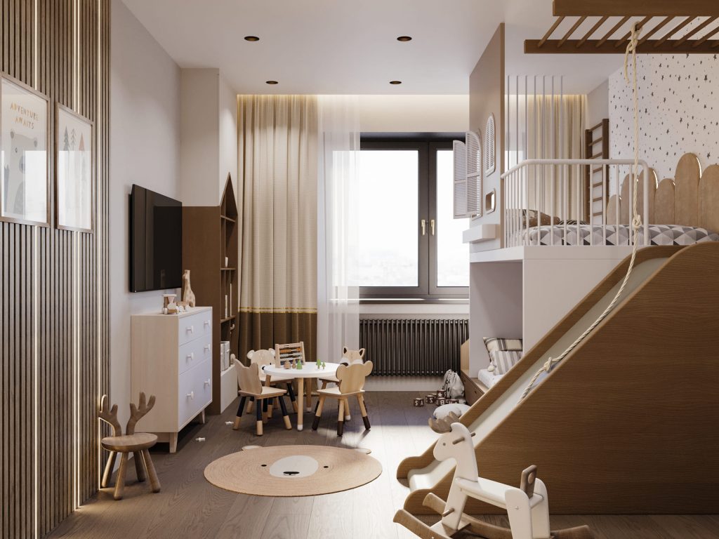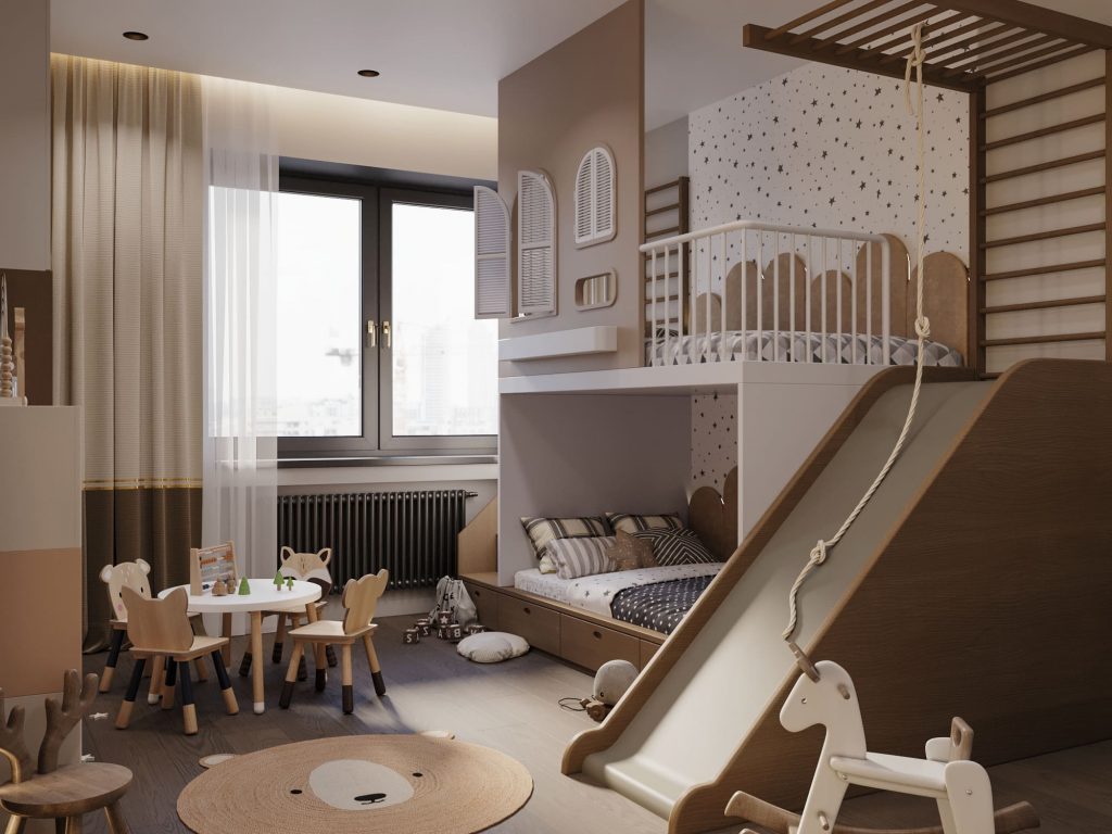 Цветовая палитра строится на серо-бежевых тонах — это спокойная, нейтральная база, которая легко адаптируется под разные настроения и не теряет актуальности со временем. В качестве контраста мы добавили элементы брутальности: они придают интерьеру характер, делают его более выразительным и взрослым, что особенно важно с учётом будущего владельца. Такой баланс позволяет пространству оставаться уютным для всей семьи сегодня и стать более сдержанным, графичным завтра.