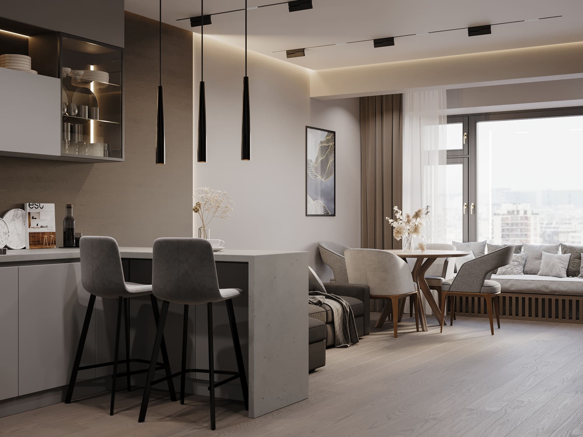 Кухонная зона организована вокруг острова, который объединяет рабочие процессы и общение. Высокие барные стулья формируют удобную зону для быстрых завтраков, а над островом мы разместили стильные подвесные светильники — они не только обеспечивают функциональный свет, но и работают как самостоятельные графические акценты.