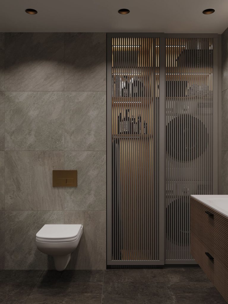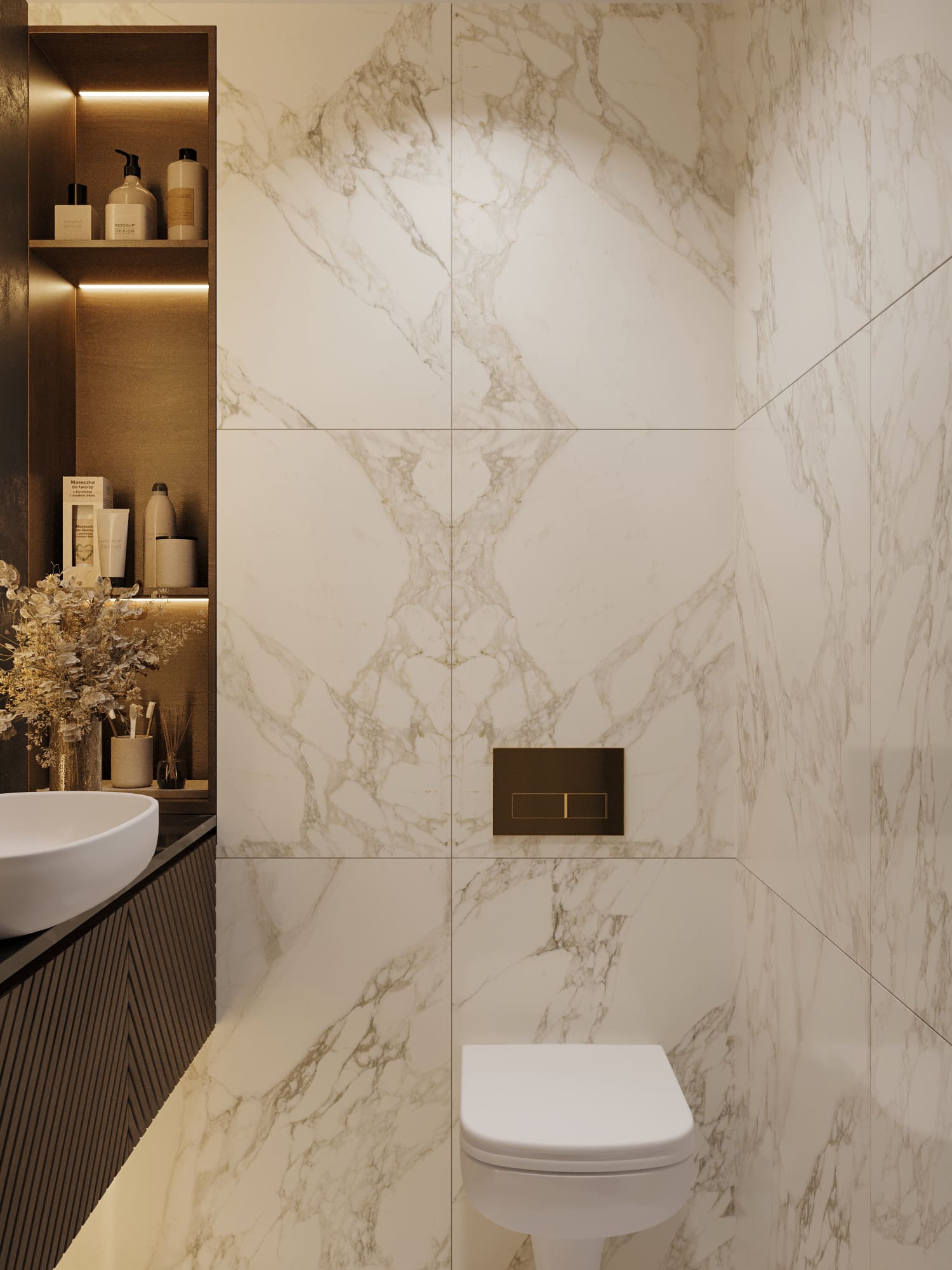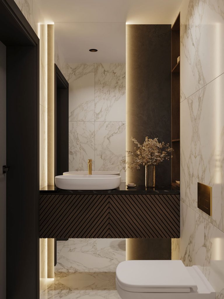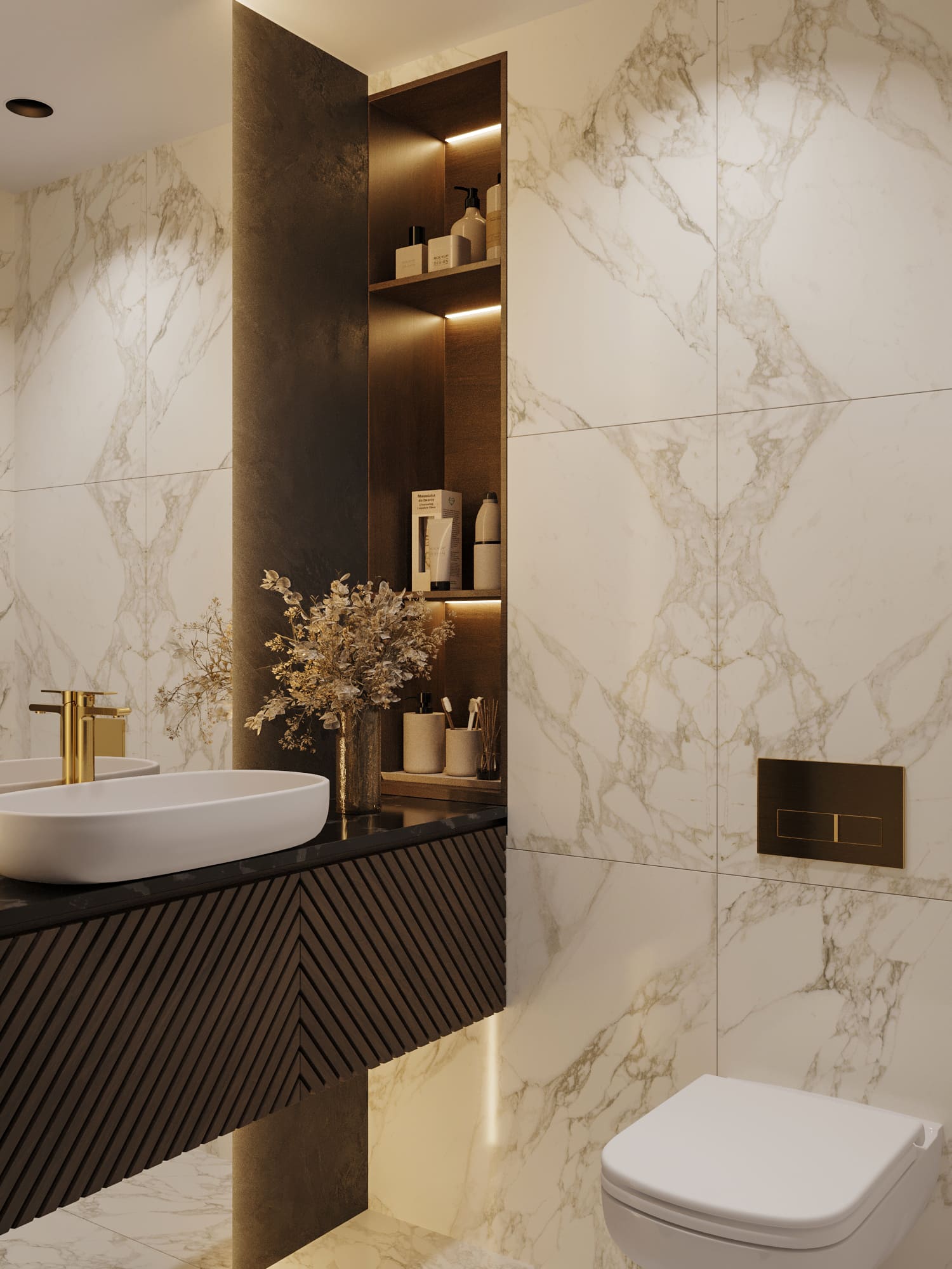 Санузел решён в элегантном ключе с акцентом на благородные материалы и продуманное освещение.