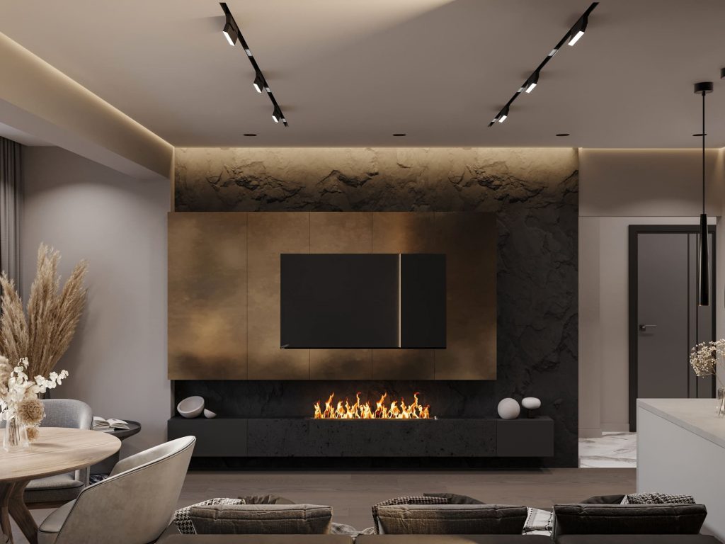 Главный акцент гостиной — стена за ТВ-зоной с эффектом под скалу. Эта фактурная поверхность задаёт интерьеру характер, становясь визуальной доминантой и добавляя пространству природной выразительности.