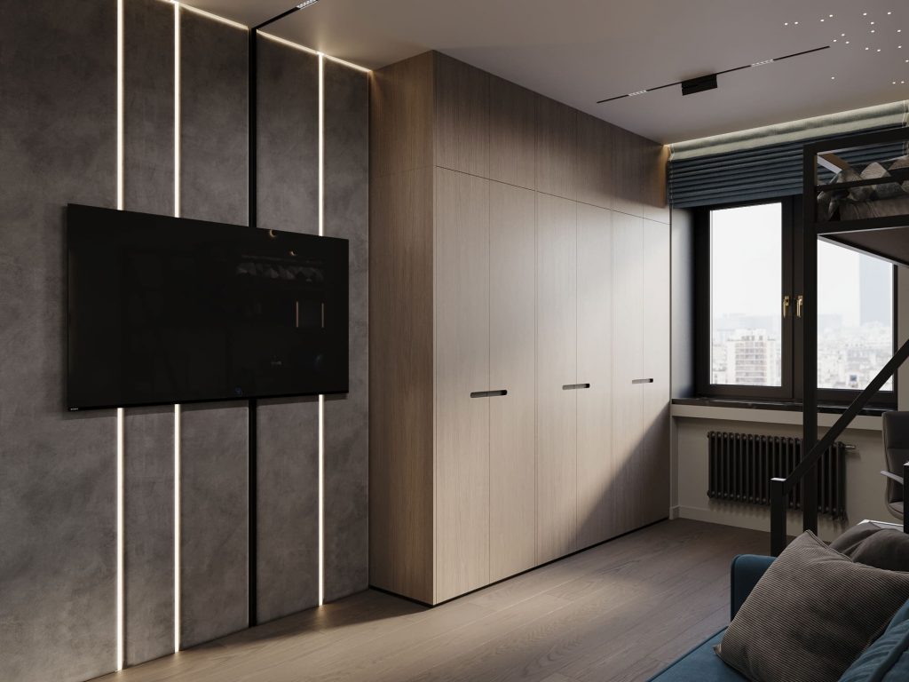 Напротив кровати установлен телевизор на акцентной стене с подсветкой. Подсветка выполняет сразу две функции: она создаёт мягкое вечернее освещение и визуально выделяет зону, не требуя дополнительных источников света.