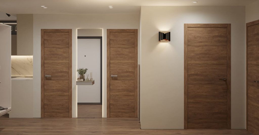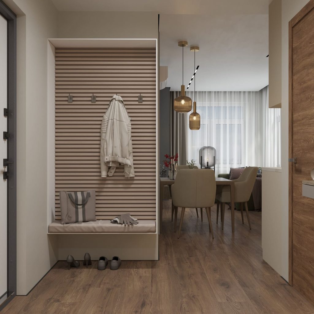 Цветовая палитра здесь выдержана в мягких бежево-деревянных тонах, а акцентная зона с рейками и мягким сиденьем у входа добавляет уюта и практичности. Здесь можно удобно присесть, снять обувь, повесить верхнюю одежду и сразу почувствовать себя дома. Отдельное внимание — освещению: мягкая подсветка вокруг зеркала и тёплые бра делают пространство визуально более глубоким и комфортным.