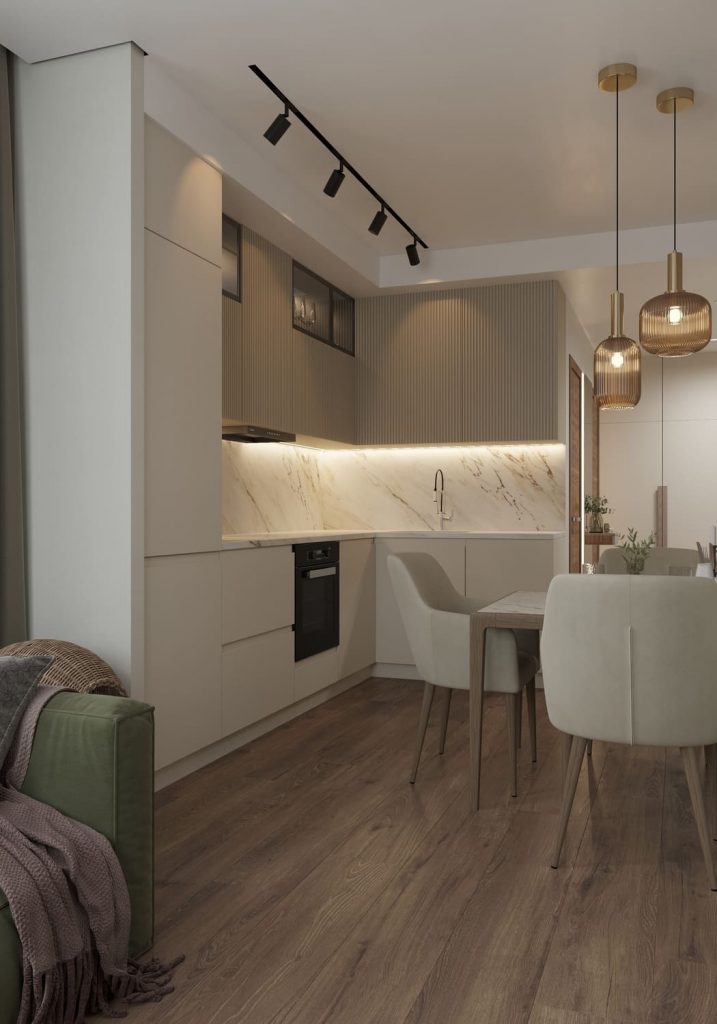 Кухонный гарнитур выполнен в лаконичном современном стиле: матовые фасады без ручек, текстурированные верхние шкафы, подсветка рабочей зоны и элегантная мраморная отделка фартука создают ощущение чистоты и порядка. Несмотря на сдержанный цвет, кухня выглядит дорого и эффектно. Чёрные элементы техники и трековое освещение добавляют структуру и лёгкий графичный акцент.