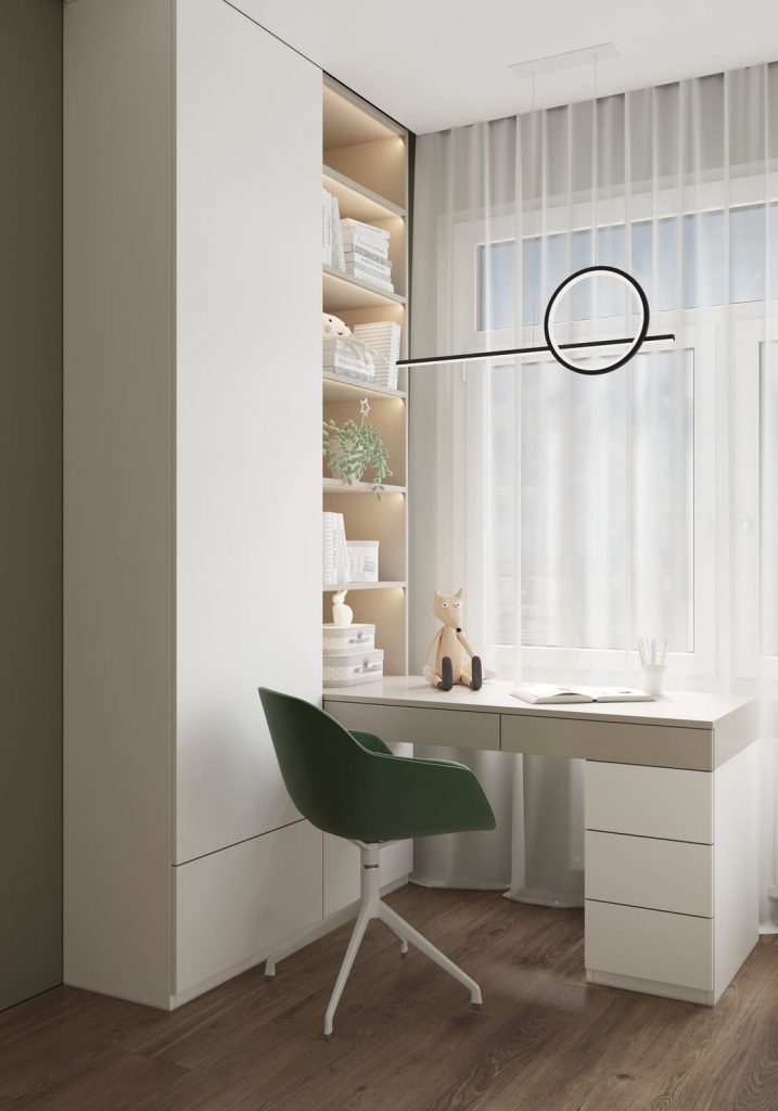 Большой письменный стол у окна обеспечивает хорошее естественное освещение — идеальное место для занятий или творчества. Стул с зелёной обивкой добавляет яркий, но ненавязчивый акцент и поддерживает общую природную гамму комнаты. Стеллажи с подсветкой и закрытые системы хранения позволяют удобно разместить всё необходимое, от игрушек до учебников.