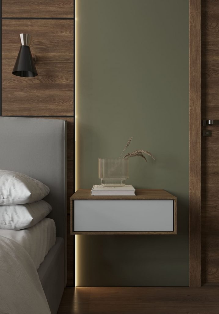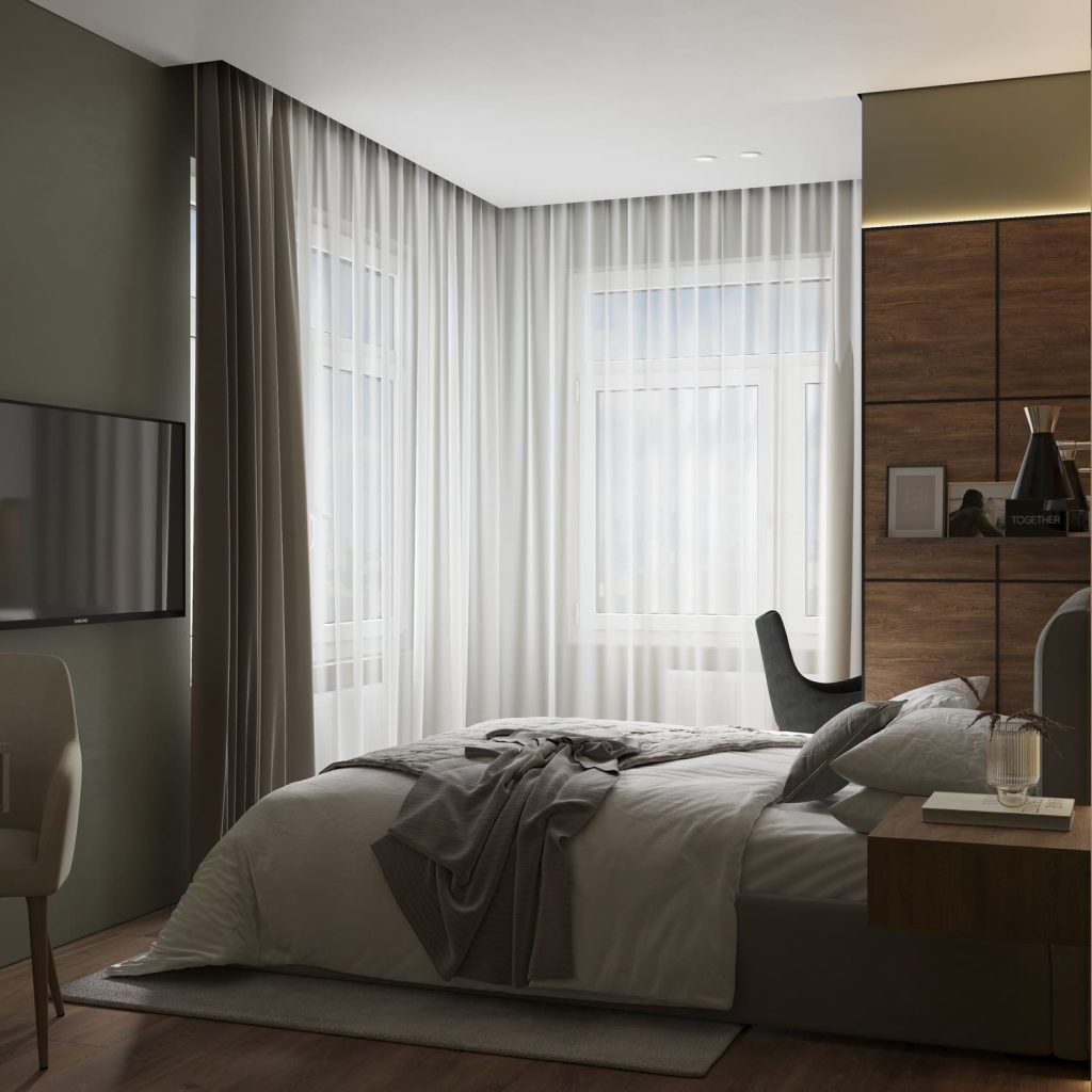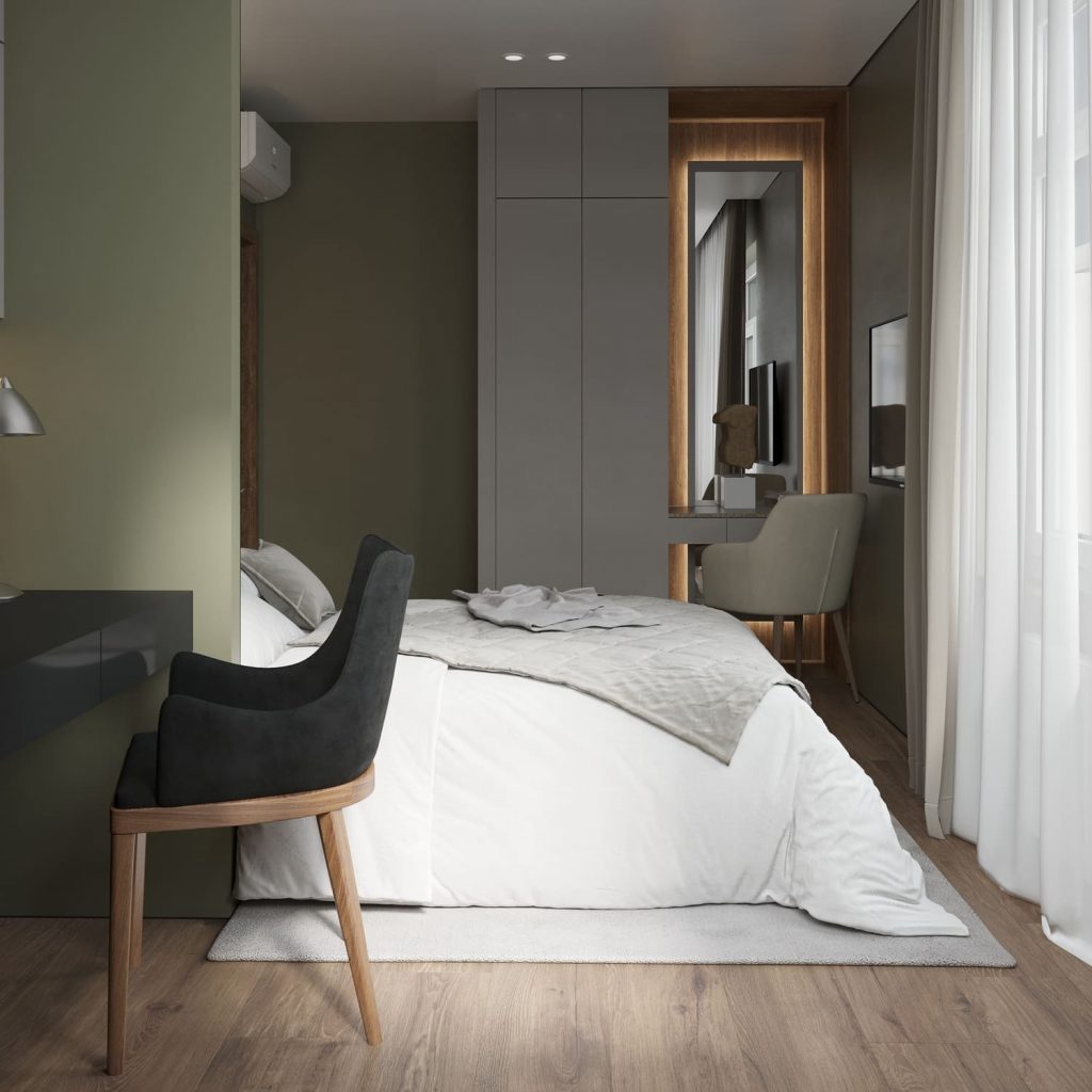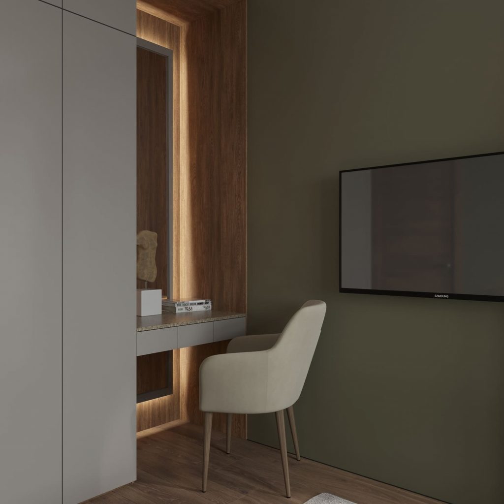 Цветовая гамма построена на мягких натуральных оттенках: беж, серый, тёплое дерево и приглушённый зелёный, который переходит на акцентную стену и перекликается с общим стилем квартиры. Панель из дерева за изголовьем кровати визуально добавляет тепла и глубины, а встроенная подсветка делает обстановку особенно атмосферной в вечернее время.