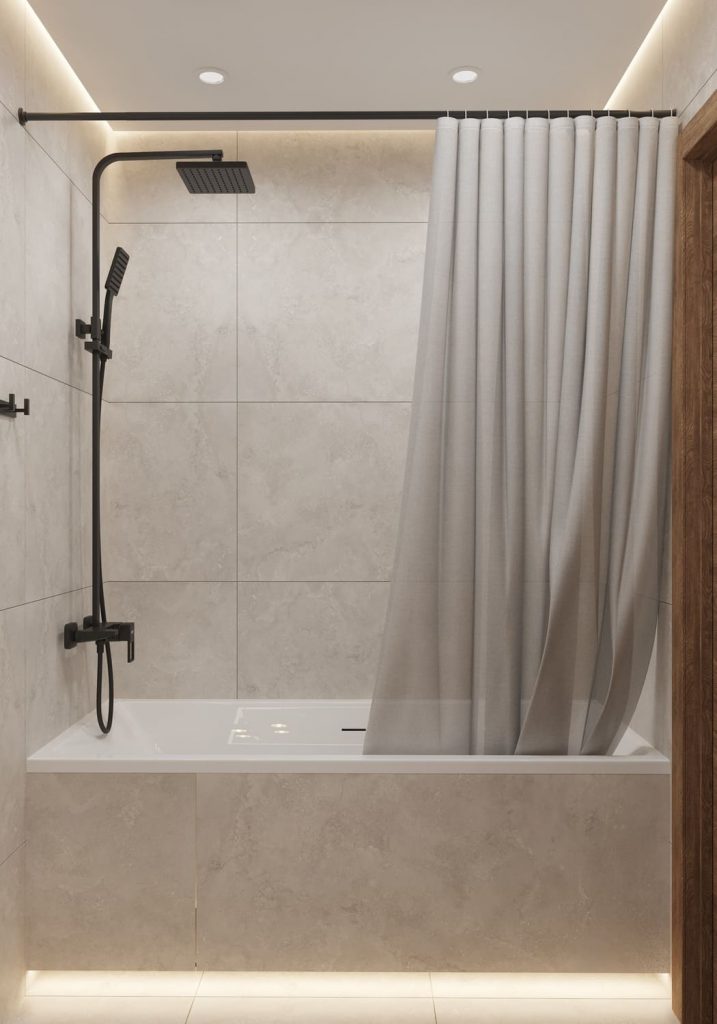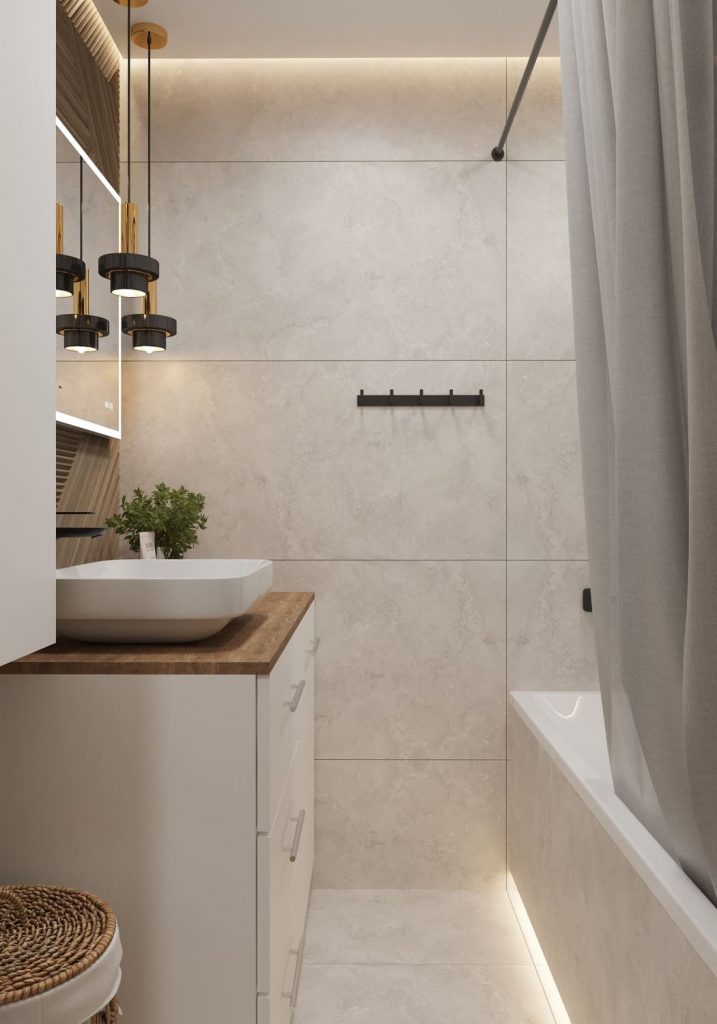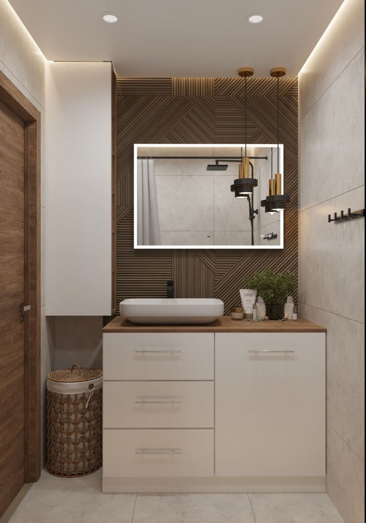 Основной акцент сделан на сочетании текстур: гладкая светлая плитка, дерево на столешнице и геометрическая деревянная панель за зеркалом создают объём и визуальную глубину. Зона умывальника организована особенно грамотно: вместительная тумба с выдвижными ящиками решает вопрос хранения, а накладная раковина смотрится лаконично и свежо. Ванна со шторкой, скрытый слив и черный душевой гарнитур подчеркивают современный характер интерьера. А подсветка по периметру потолка и внизу стены делает пространство визуально выше и уютнее. Каждая деталь здесь на своём месте — от корзины для белья из плетёной лозы до компактного крючка на стене.