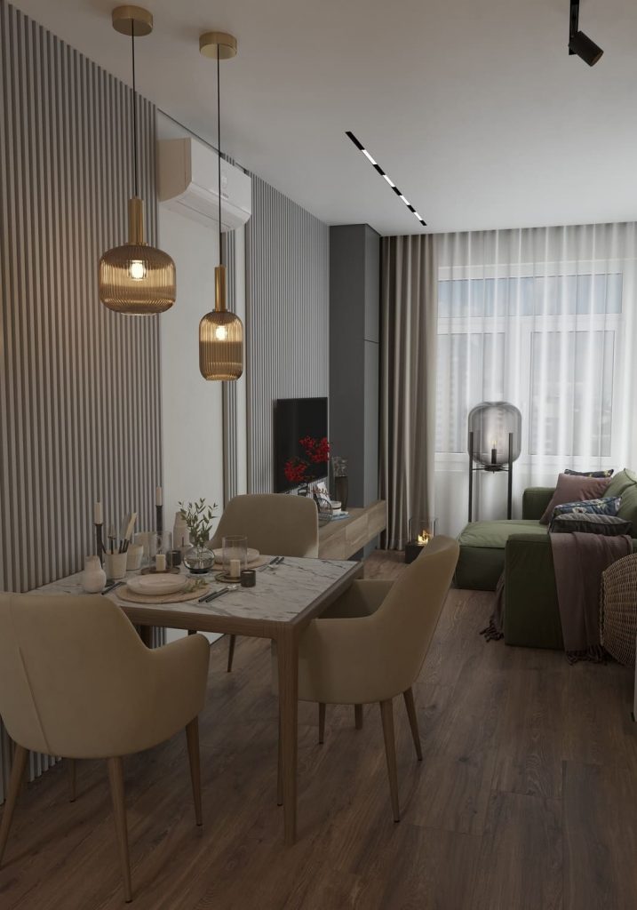 Зона столовой — это уютный островок, идеально подходящий и для ужина вдвоём, и для приёма гостей. Мягкие стулья в нейтральной обивке, стол с мраморной столешницей и подвесные светильники с тёплым светом создают атмосферу уюта и лёгкой камерности.