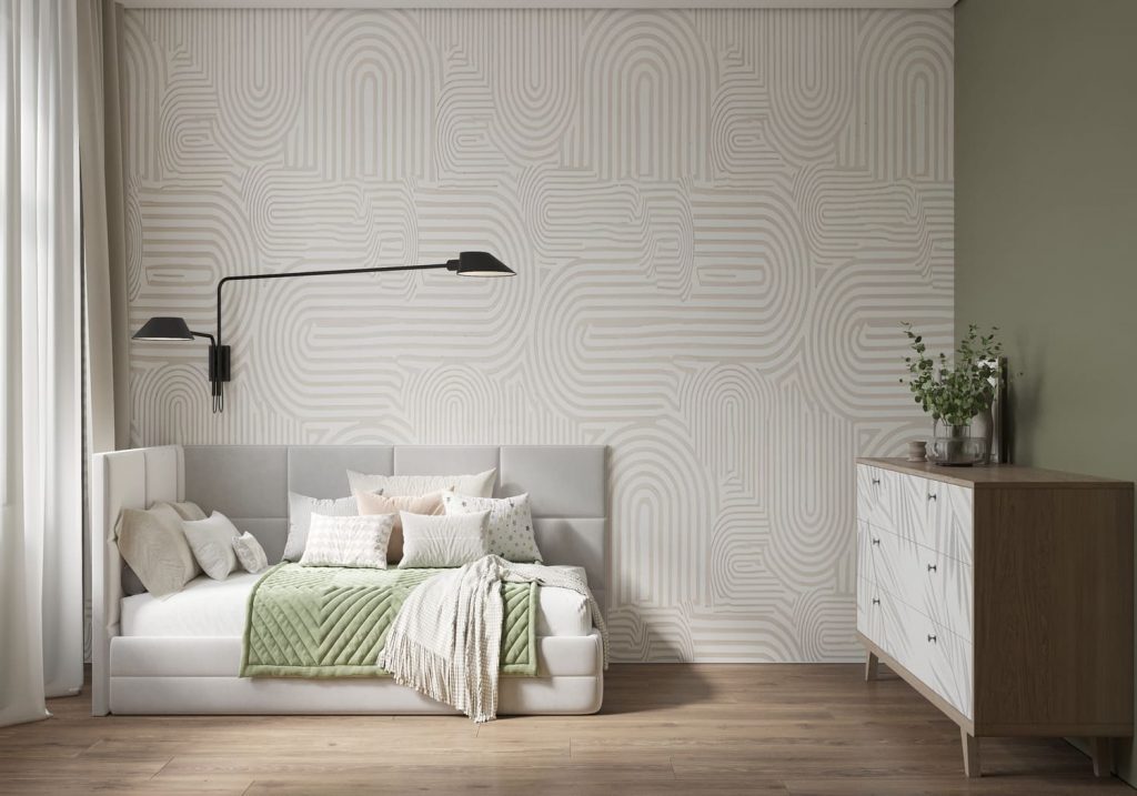 Мягкая кровать с высоким изголовьем и уютным текстилем словно приглашает к отдыху и чтению перед сном. Светло-зелёное покрывало и подушки в пастельных тонах добавляют свежести и визуальной мягкости. Акцентная стена с графичными обоями оживляет интерьер, при этом не перегружая его — всё очень сбалансировано.