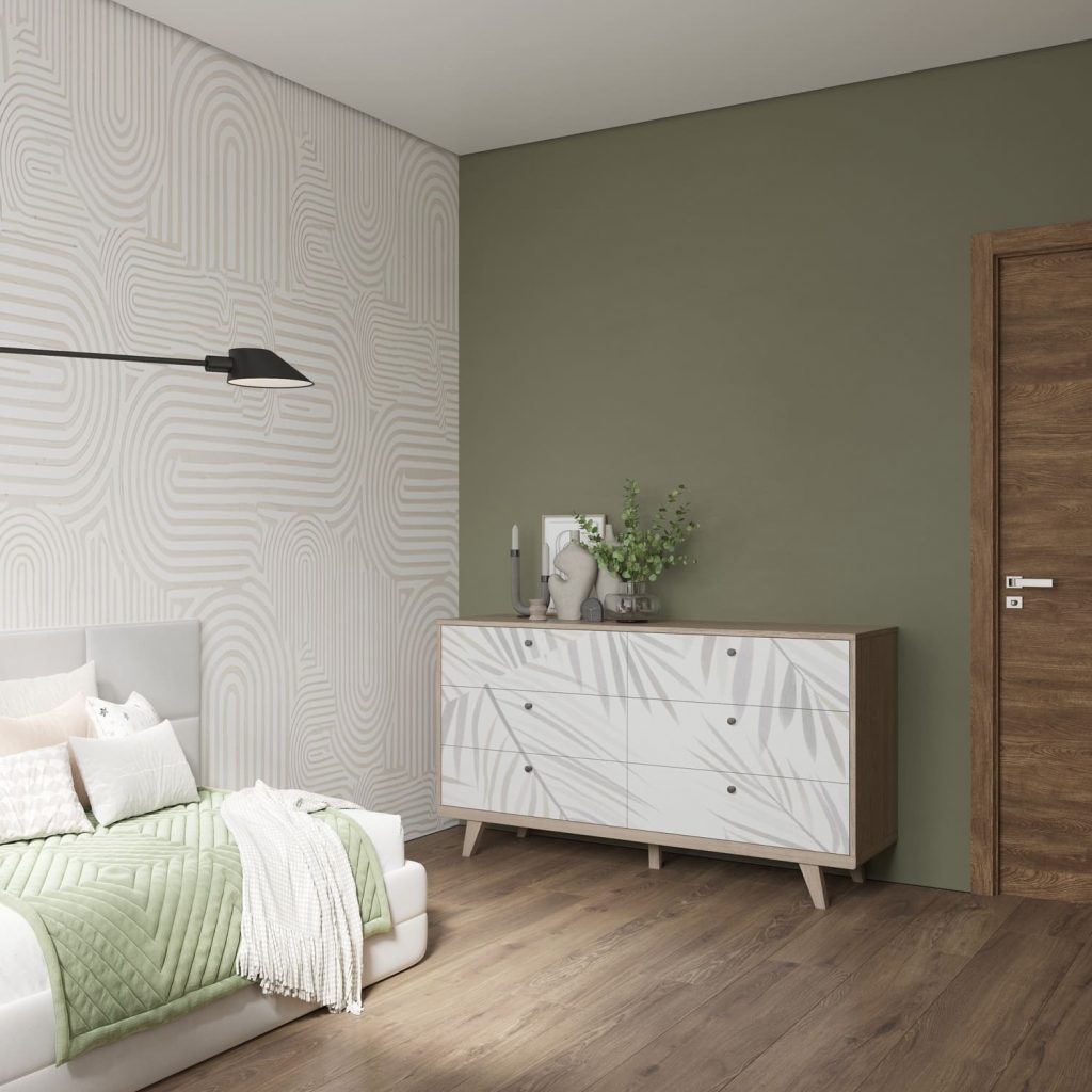 Комната дополнена дизайнерским комодом с растительным принтом, который перекликается с общей природной темой.