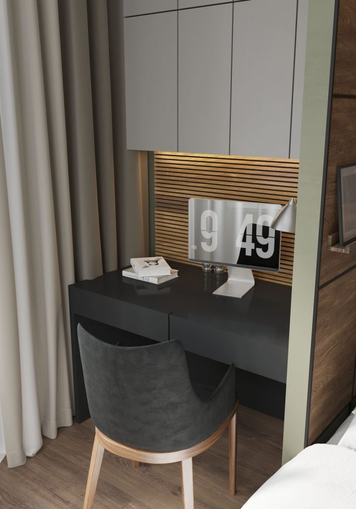 Спальня получилась уютной, спокойной и невероятно продуманной — идеальное пространство для восстановления и уединения. Именно здесь реализовано одно из ключевых пожеланий пары: полноценное рабочее место, которое не мешает отдыху второго партнёра. За счёт частичной перегородки удалось зонировать комнату так, чтобы и кровать, и рабочий стол воспринимались как отдельные функциональные зоны, но при этом сохранялась целостность интерьера.