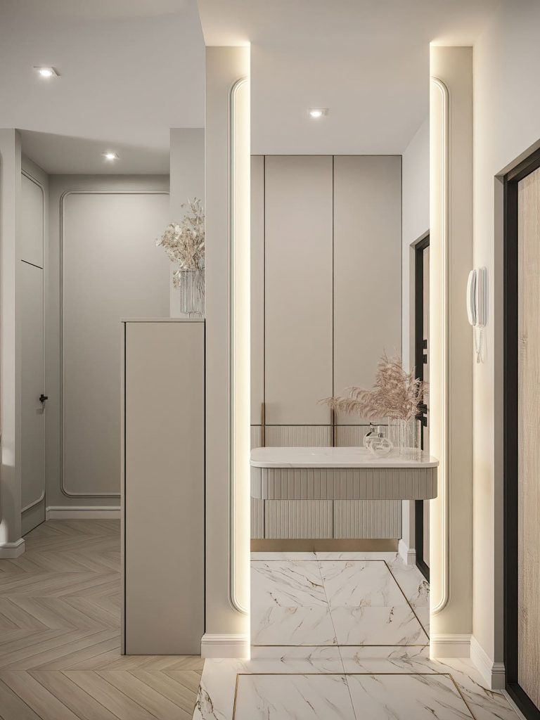 Прихожая этой квартиры сразу задаёт настроение всему интерьеру — светлая, изящная и тщательно продуманная до мелочей. Здесь легко угадываются неоклассические нотки, но они поданы в современной, минималистичной форме: с мягкими оттенками, лаконичными фасадами и деликатными акцентами.