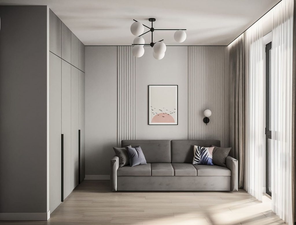 Дизайн-проект евротрешки для семьи из трех человек в серых тонах с цветовыми акцентами в текстиле