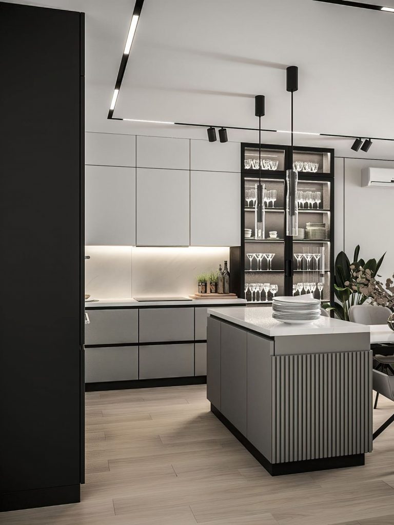 Фасады кухни выполнены в спокойных серых тонах без лишнего декора — лаконично и стильно. Благодаря встроенной технике и отсутствию ручек, поверхность выглядит цельной и аккуратной. Центральный остров с рифлёными панелями не только зонирует пространство, но и становится дополнительной рабочей поверхностью — удобной как для готовки, так и для быстрых завтраков. Подвесные светильники над ним создают акцент и уютную зону освещения.