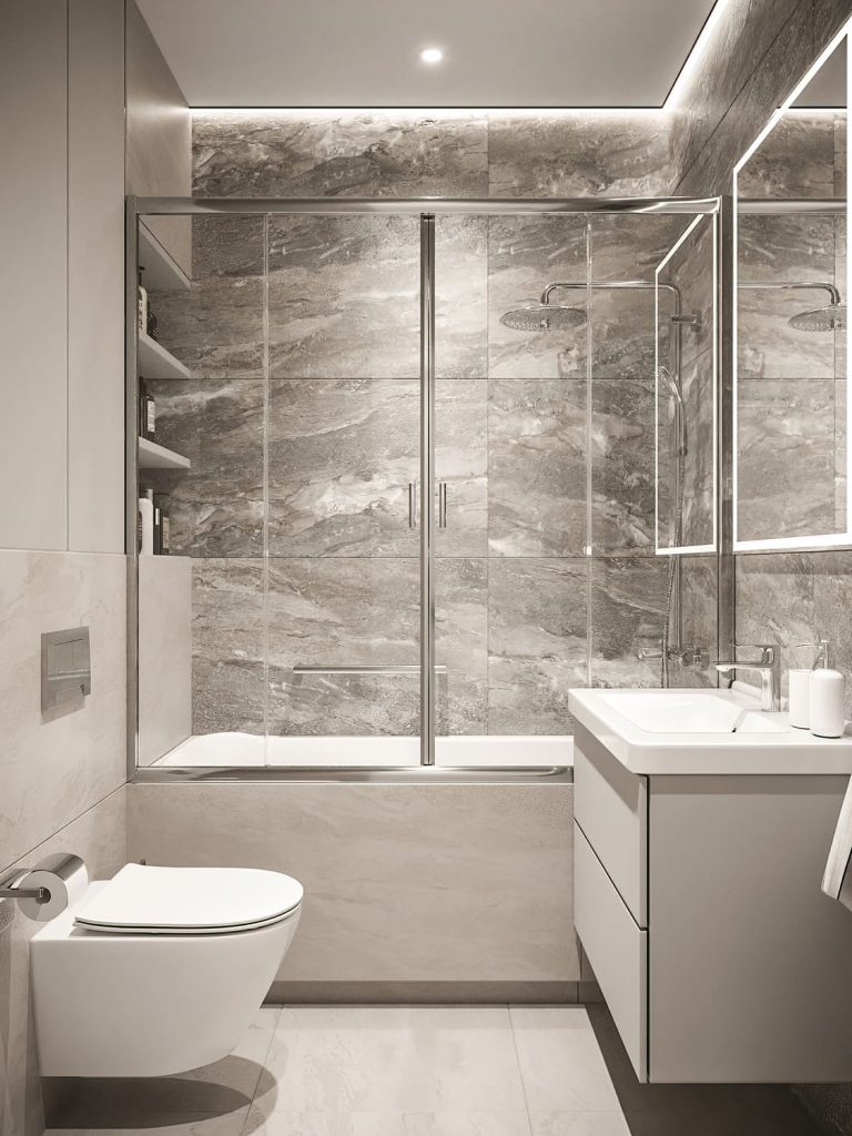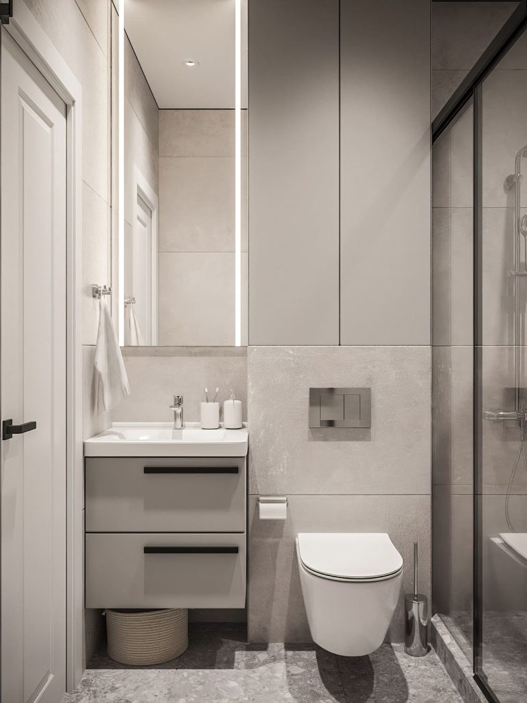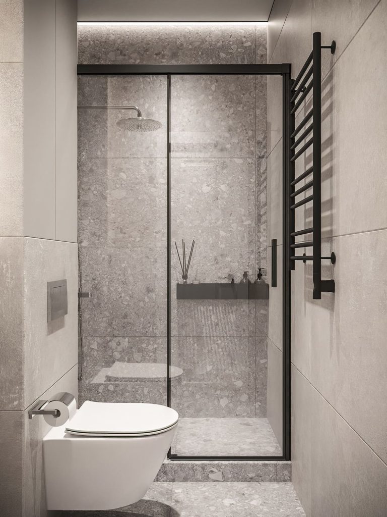 Стены отделаны крупноформатной плиткой с текстурой камня, что создаёт впечатление целостности и простора. Множество световых акцентов, включая встроенные светильники и подсветку зеркала, придают комнате лёгкость и воздушность. Душевая зона отделена стеклянной перегородкой с чёрной металлической рамой — строгая, но не перегружающая пространство. Чёрный цвет элементов — это тонкий контраст к нейтральным серым тонам, что добавляет изысканности и модернизма. Раковина с аккуратным минималистичным шкафчиком, в который удобно складывать все необходимые средства, завершает образ. Практичные и стильные элементы, такие как дизайнерский полотенцесушитель и дополнительные полочки для мелочей, делают пространство не только эстетичным, но и удобным для повседневного использования.