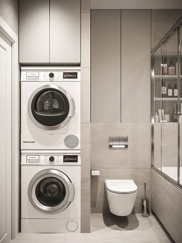Важным элементом является также встроенная стиральная машина, которая эффективно скрыта за фасадами шкафов, обеспечивая дополнительное место для хранения и не нарушая целостность дизайна.