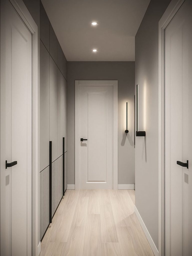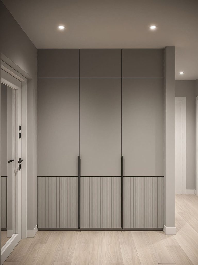 С первого взгляда видно: в этой прихожей всё продумано до мелочей. Пространство встречает спокойной серой палитрой, которая идеально вписывается в современный минимализм, выбранный для всей квартиры. При этом интерьер не выглядит скучным — за счёт фактур, вертикальных линий и грамотных акцентов он остаётся живым и стильным.