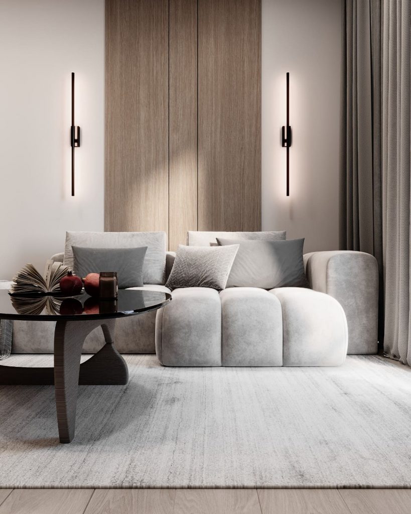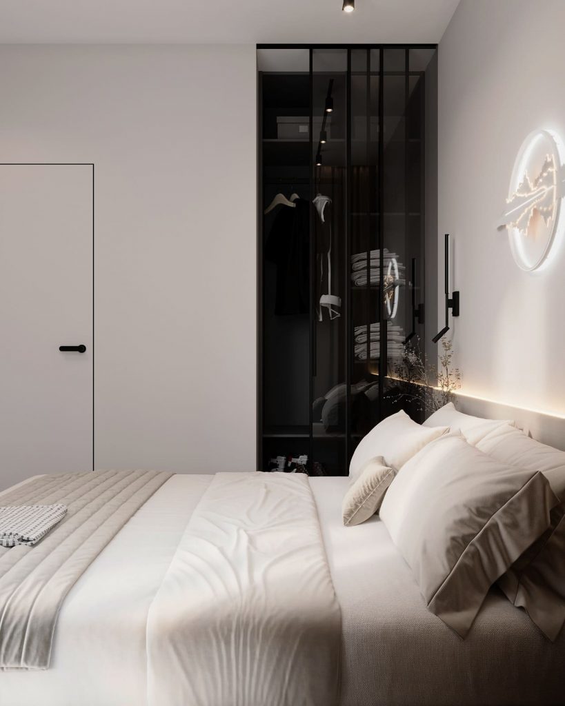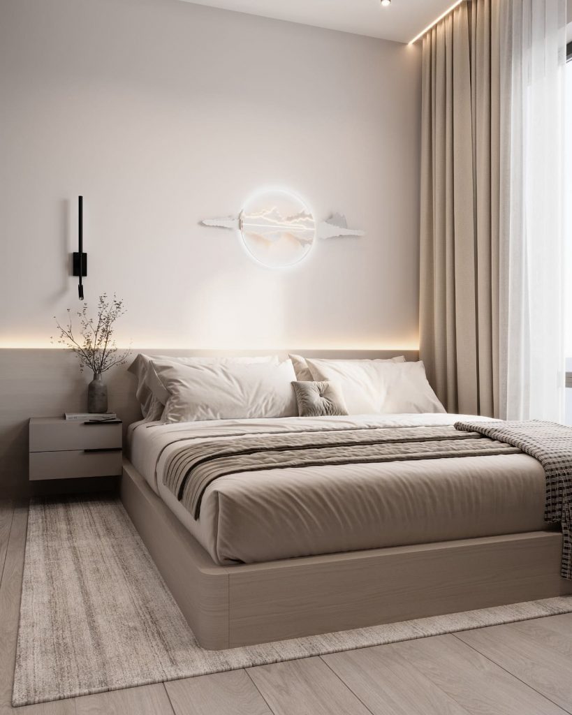 Главная роль — у кровати с высоким основанием и текстильным изголовьем, над которым — арт-объект с подсветкой, отсылающий к линиям горизонта или звуковым волнам. Эта декоративная деталь будто фиксирует момент тишины, идеально подходящий для вечернего настроения.