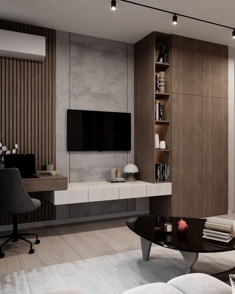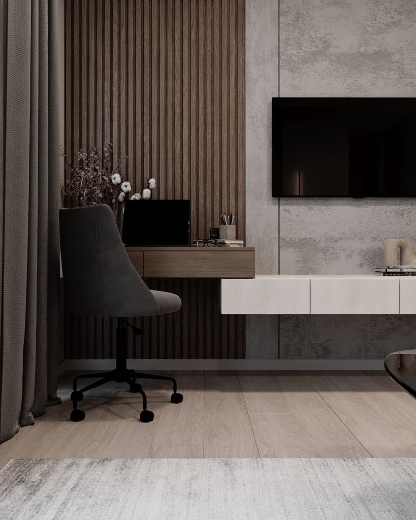 Гостиная организована вокруг уютного дивана с округлыми формами и мягкой обивкой. Напротив — компактная ТВ-зона с настенным телевизором, подвесной тумбой и удобным рабочим местом, которое не выбивается из общей эстетики. Стеновые панели с вертикальной текстурой не только визуально вытягивают пространство, но и служат фоном для мебели и декора.