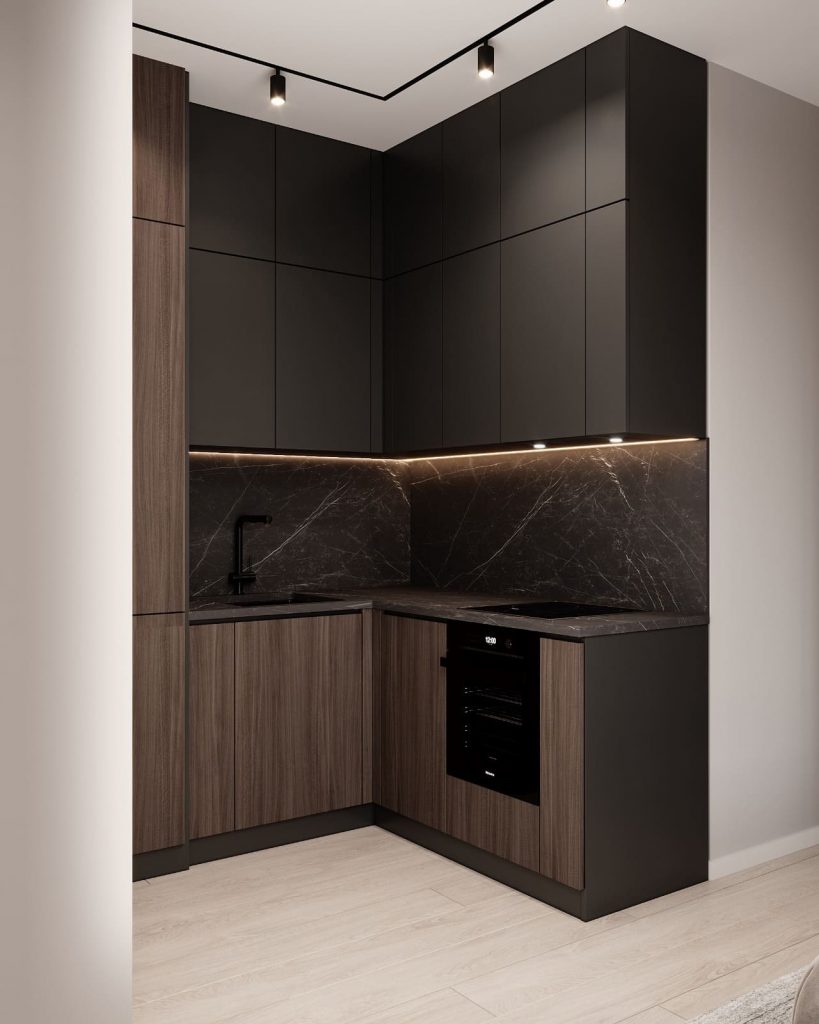 Зона кухни выполнена в тёплых древесных тонах с глубокими графитовыми акцентами. Верхние шкафы до потолка обеспечивают максимум хранения, а фартук и столешница с фактурой тёмного камня добавляют интерьеру драматичности и стиля. Встроенная техника и скрытые ручки подчёркивают лаконичность современной кухни.