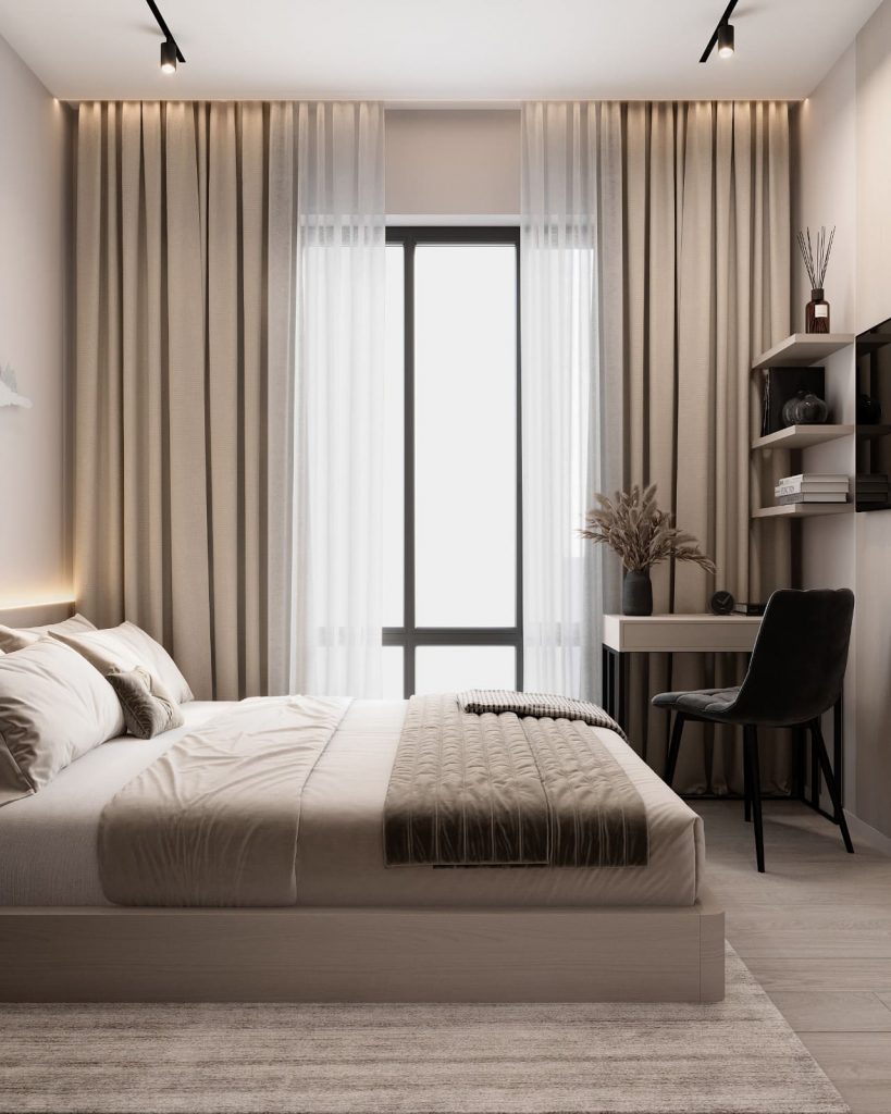 Натуральные ткани, мягкий ковёр и двухслойные шторы делают пространство уютным в любое время суток.