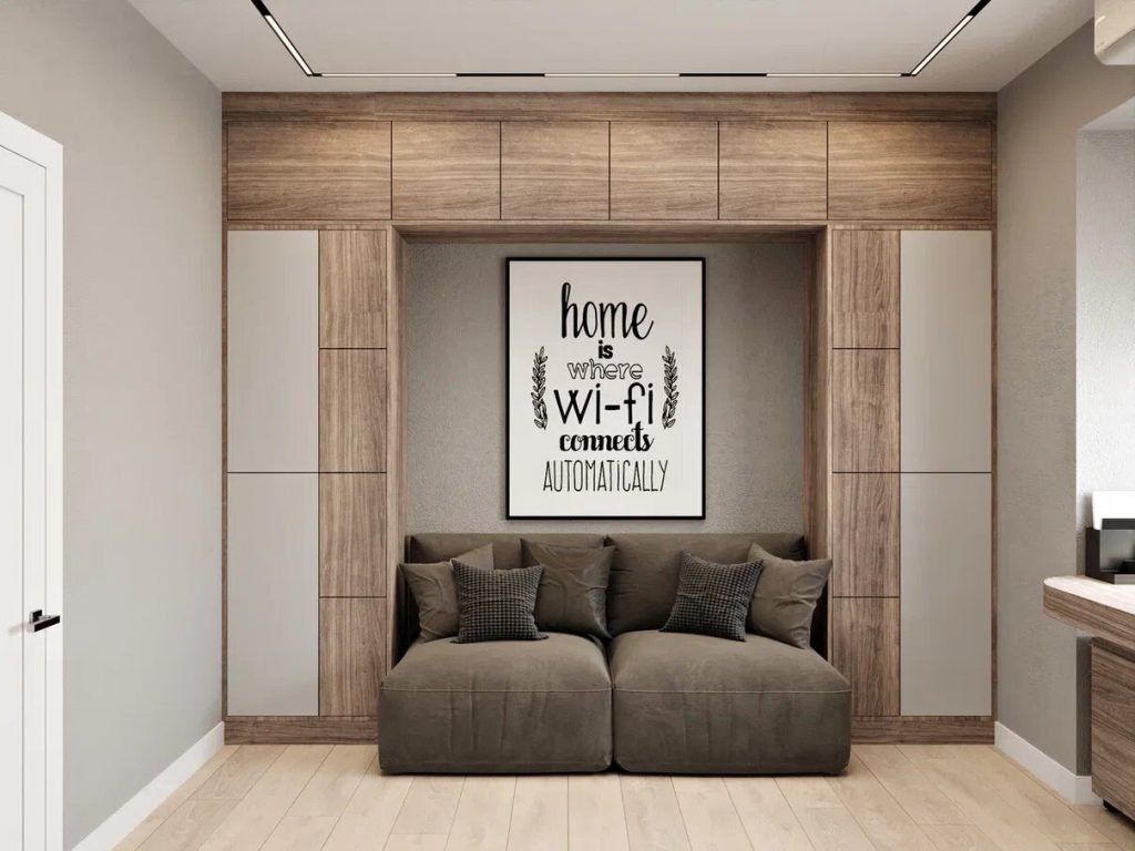 Кухня-гостиная создает единое пространство с прихожей и коридором. В гостиной разместился глубокий диван и раскладной кофейный столик-трансформер, который при желании разбирается в полноценный обеденный стол. Телевизор встроен в специально спроектированную зону с хранением, игровой приставкой, подсветкой, шкаф с хранением плавно перетекает в кухню, особенностью которой является мобильная барная стойка. Для сохранения простора она убирается к стене. В кухне есть все необходимое, несмотря на небольшую площадь помещения, уместилось вся необходимая техника и рабочая поверхность. В глубоком оконном откосе разместилась уютная зона отдыха в виде подвесной скамьи с мягким сиденьем.